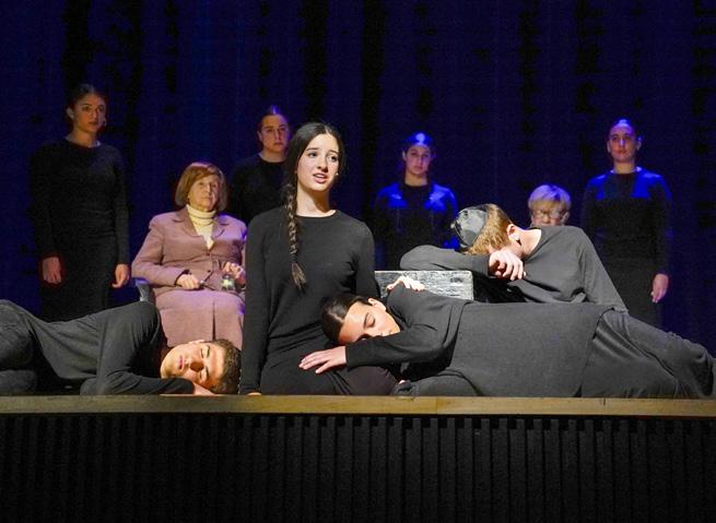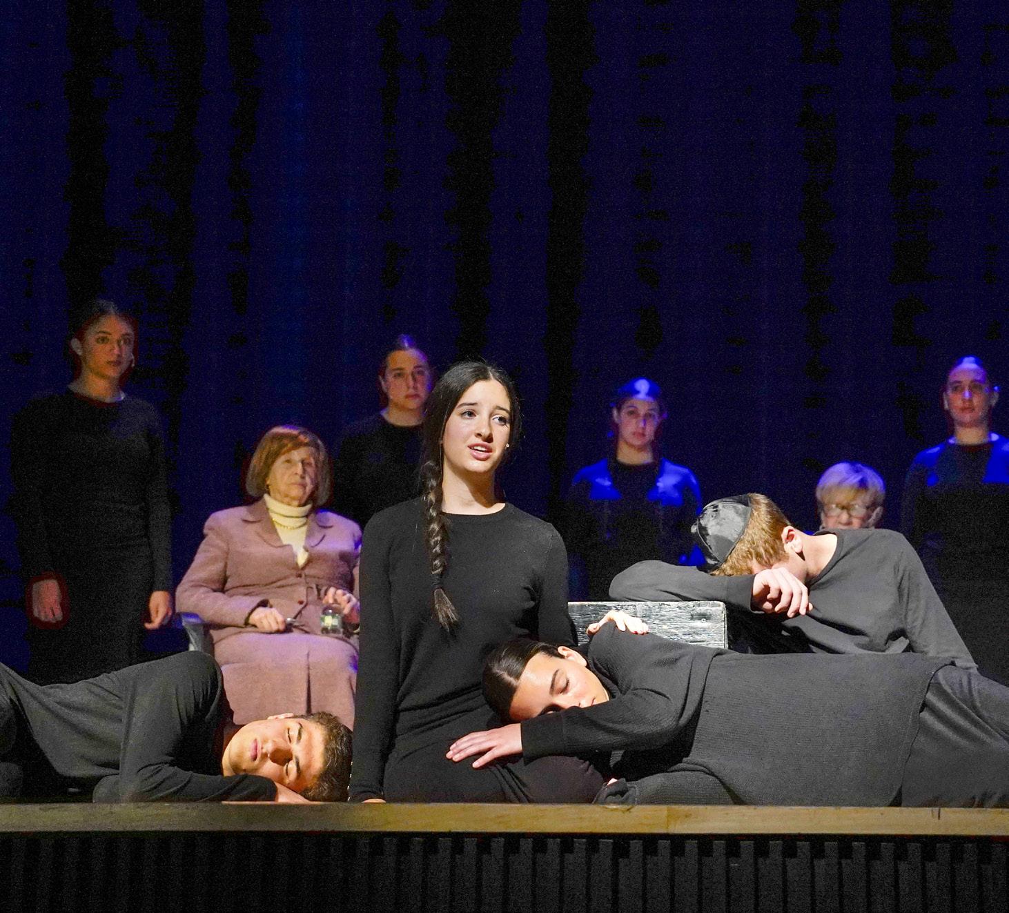 We Are Here, written and directed by YOF YOFHS Director of the Arts and Creative Arts Therapist Sally Grazi-Shatzkes, was the culmination of the year-long Witness Theater program. Witness Theater is an intergenerational journey that invites Holocaust survivors to share their stories of survival with students who will ultimately reenact their stories. Working together every week, the two generations build strong relationships as they explore issues of war, loss and trauma. The stories shared are especially poignant now, in this time of widespread antisemitism and unrest across the country.