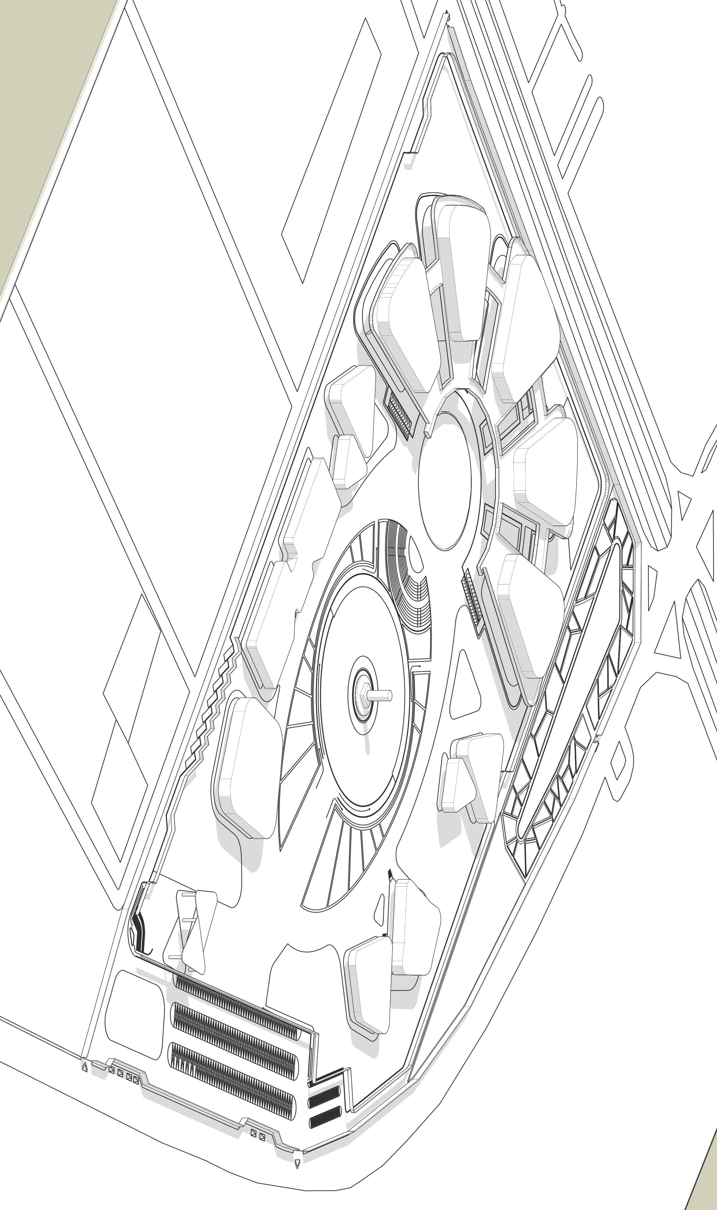 The form is a 'Ziggurat' 38m high with a spiral shaped ramp around the center. The descending spiral of the Dynamo�on hall resemble a massive ziggurat. It is planned as inward looking building with a closed atrium.