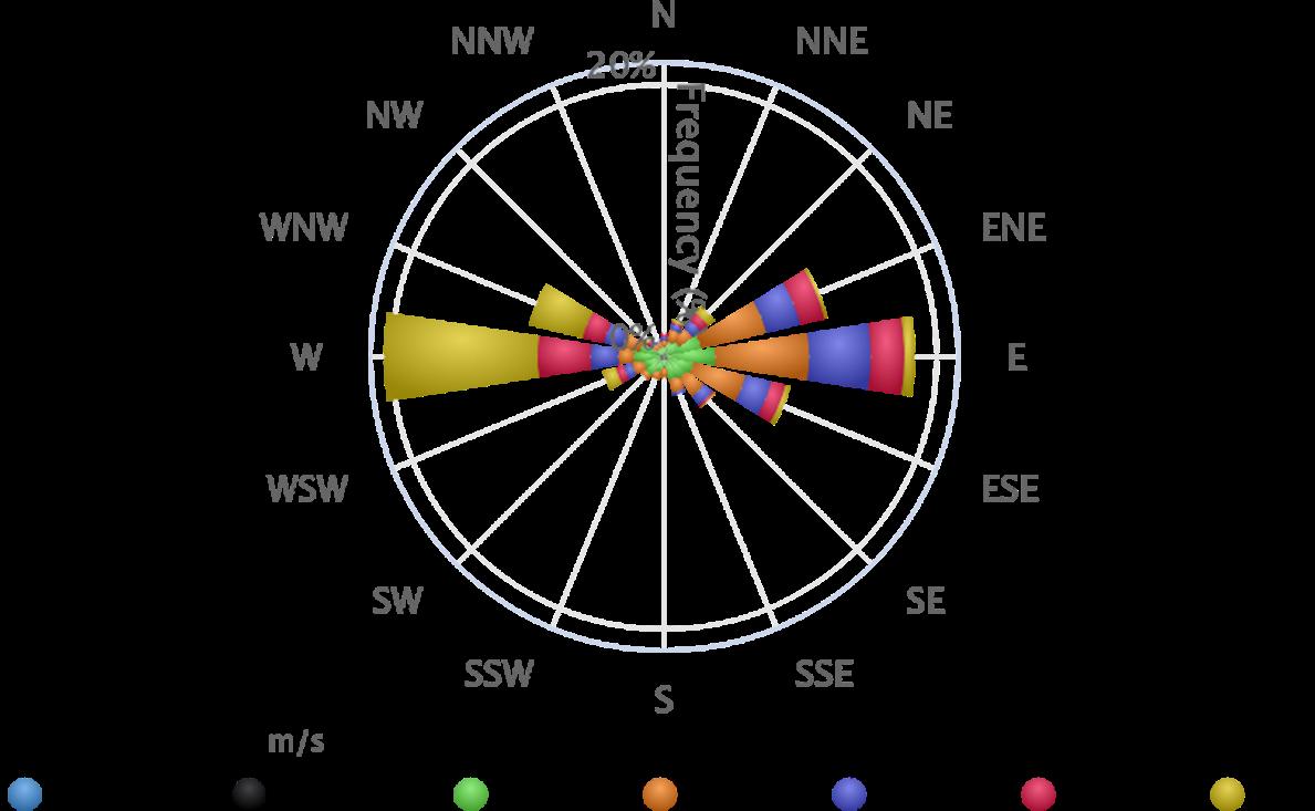 Windrose of Bengaluru shows that predominantly wind blow from the West - about 20.54% of all wind direc�ons.