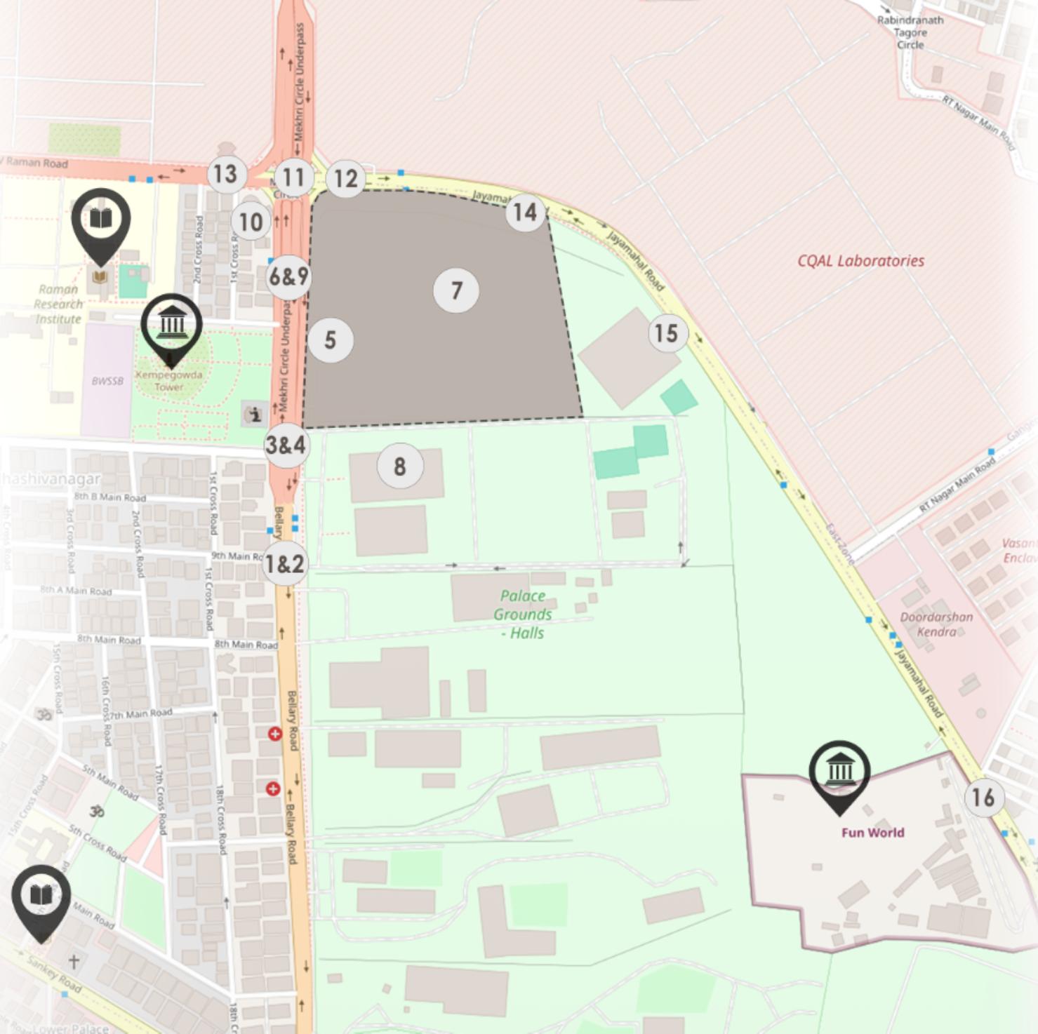 Museum is well connected to the other gov.blocks library,highcourt etc through the central cubbon park as main transi�on area.It is surrounded by Front- Kasturba Road. Le�- Venkatappa Art Gallery. RarePark. it is also surrounded by stately buildingslike Vidhan Soudha, High Court etc. It is 5kms from city railway and bus sta�on.
