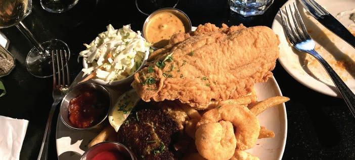 Carolina Seafood Platter o ers up to three choices, all of which are also available as separate entrées. I got Fried Shrimp, Flounder, and a Crabcake. I liked the shrimp best — good flavor, tender interior, crisp exterior. The flounder is thin, tilting toward a gelatinous interior, but fried nice and crisp. The crabcake is good enough, but the menu promises lump meat; in my serving, the crab was broken up and distributed, bearing flavor more akin to backfin. This comes with coleslaw (fresh-tasting, not stalky), and crisp French fries, fairly thick cut, that generate a moderate level of potato flavor.