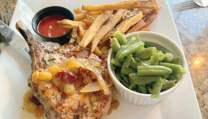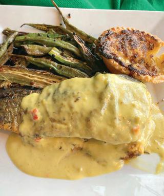We enjoyed several seafood entrees. Cajun Catfish is sourced from a North Carolina farm. It is delicately flavored, sharpened with tartar sauce, the crisp batter akin to tempura. This sustains clean flavor throughout. Lump Crab Stuffed Trout is also an in-state product, appropriately light in flavor, wellserved by crab stuffing, these flavors deepened with avocado cream sauce, for a rich result.