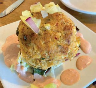 Take, for example, a Crab Cake starter. It’s large enough to serve as an entrée, and it’s loaded with quality lump crabmeat, whose flavor is evident. (You might think that a crabcake that tastes like crabmeat would be the norm, but if you pay attention, most crabcakes taste more like the filler than the main ingredient.) It is placed over a tart, crunchy fried green tomato slice, flanked by freshly made cole slaw. Dabs of tomato aioli round out the presentation and the flavor profile.