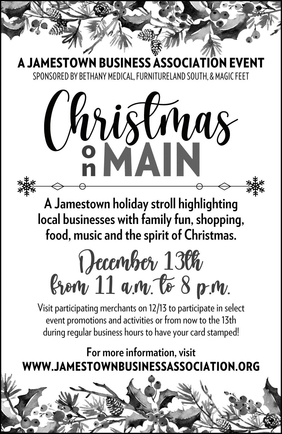 This year, the Jamestown Business Association, which coordinates Christmas on Main, is creating a spectacular Saturday event highlighting local businesses, family fun, shopping, food and music. As you visit participating merchants, be sure to get your card stamped at each one to be eligible for a prize drawing. Cards may be found at participating businesses.