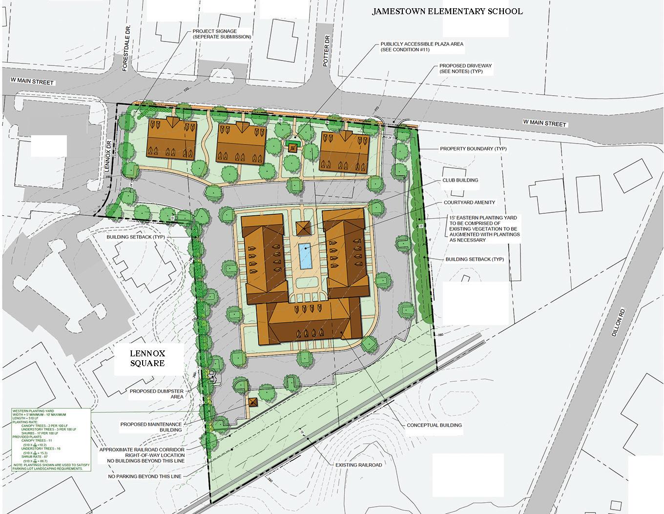 Burkely’s proposed plan includes a mix of mansion or manor-style apartments fronting West Main Street and three-story apartment buildings toward the rear of the approximately 6.53-acre site. The design of the buildings would be compatible with the Jamestown National Register Historic District in which it is located. They would look like large single-family homes. All parking would be behind these apartment buildings.