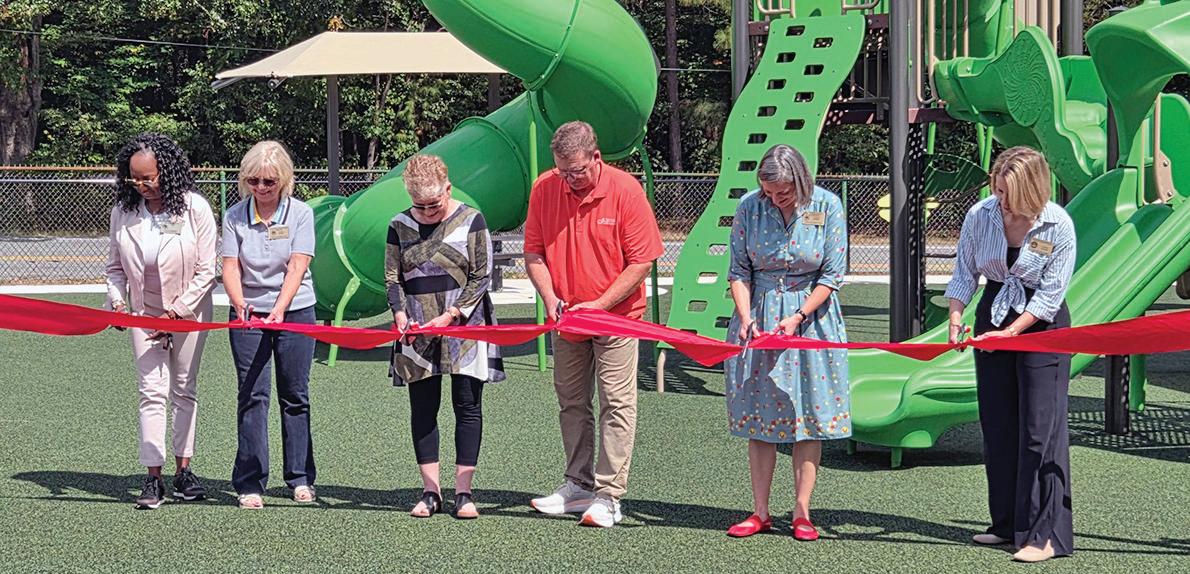 (left to right) town councilmembers Pam Burgess and martha wolfe, mayor lynn montgomery, Parks & Recreation director Scott coakley, councilmembers Rebecca Rayborn and Sarah Glanville cut the ribbon, officially opening the new playground.