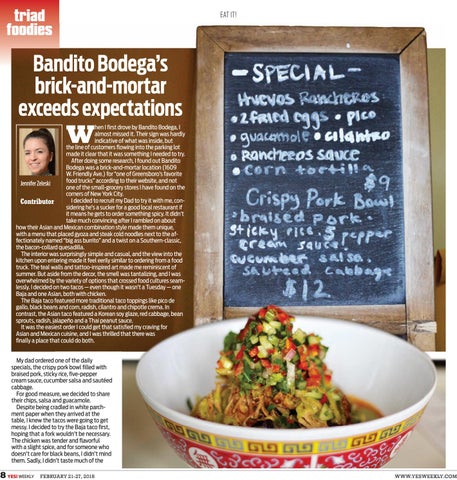 hen I first drove by Bandito Bodega, I almost missed it. Their sign was hardly indicative of what was inside, but the line of customers flowing into the parking lot made it clear that it was something I needed to try. After doing some research, I found out Bandito Bodega was a brick-and-mortar location (1609 W. Friendly Ave.) for “one of Greensboro’s favorite food trucks” according to their website, and not Jennifer Zeleski one of the small-grocery stores I have found on the corners of New York City. I decided to recruit my Dad to try it with me, conContributor sidering he’s a sucker for a good local restaurant if it means he gets to order something spicy. It didn’t take much convincing after I rambled on about how their Asian and Mexican combination style made them unique, with a menu that placed gyoza and steak cold noodles next to the affectionately named “big ass burrito” and a twist on a Southern-classic, the bacon-collard quesadilla. The interior was surprisingly simple and casual, and the view into the kitchen upon entering made it feel eerily similar to ordering from a food truck. The teal walls and tattoo-inspired art made me reminiscent of summer. But aside from the decor, the smell was tantalizing, and I was overwhelmed by the variety of options that crossed food cultures seamlessly. I decided on two tacos — even though it wasn’t a Tuesday — one Baja and one Asian, both with chicken. The Baja taco featured more traditional taco toppings like pico de gallo, black beans and corn, radish, cilantro and chipotle crema. In contrast, the Asian taco featured a Korean soy glaze, red cabbage, bean sprouts, radish, jalapeño and a Thai peanut sauce. It was the easiest order I could get that satisfied my craving for Asian and Mexican cuisine, and I was thrilled that there was finally a place that could do both. My dad ordered one of the daily specials, the crispy pork bowl filled with braised pork, sticky rice, five-pepper cream sauce, cucumber salsa and sautéed cabbage. For good measure, we decided to share their chips, salsa and guacamole. Despite being cradled in white parchment paper when they arrived at the table, I knew the tacos were going to get messy. I decided to try the Baja taco first, hoping that a fork wouldn’t be necessary. The chicken was tender and flavorful with a slight spice, and for someone who doesn’t care for black beans, I didn’t mind them. Sadly, I didn’t taste much of the