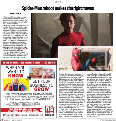 Spider-Man reboot makes the right moves BY MATT BRUNSON It’s remarkably easy and completely understandable to complain about superhero fatigue, until one realizes that the superheroes are the ones saving the day — and the box office. While this summer’s other franchise pictures have been performing below expectations — regardless of whether they’re good (Alien: Covenant), bad (Transformers: The Last Knight) or just downright ugly (Pirates of the Caribbean: Dead Men Tell No Tales) — it’s the efforts from the cinematic branches of Marvel and DC that have prevented this movie season from being a total washout. More importantly, in terms of quality, both Guardians of the Galaxy Vol. 2 and especially Wonder Woman have proven to be among the few bright spots — and now here comes Spider-Man: Homecoming ( ) to further strengthen the argument. The best Spider-Flick since 2004’s Spider-Man 2, this one finds Tom Holland justifying the goodwill generated by his supporting stint in last year’s Captain