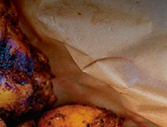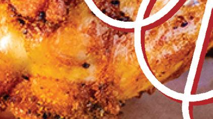 tender, richly flavored in their own right, plated with shredded duck meat, also cooked soft. Throw in locally grown mushrooms, and you get a rewarding result. Lemon Spaghetti is light in initial impact, gaining complexity from peppery-fresh arugula and roasted tomatoes. You can add proteins to thischicken, shrimp, or lobster. My wife chose shrimp and found tender texture that marries well with the citrusy pasta sauce. Pork Schnitzel is sliced thin, coated with breadcrumbs, and fried crisp. The pork flavor is excellent in its own right, but it gains from a topping of fried egg, plus carrots and radishes, scattered with feta cheese crumbles, and salsa verde. A whole hot pepper alongside will light you up, but it tastes really good. Just don’t try to eat too much too fast. Chicken Paillard is breast meat, pounded thin, flash-sauteed in a very hot pan. The e ect generates crusty flavor, sharpened with lemon sauce, presented over fusilli pasta.