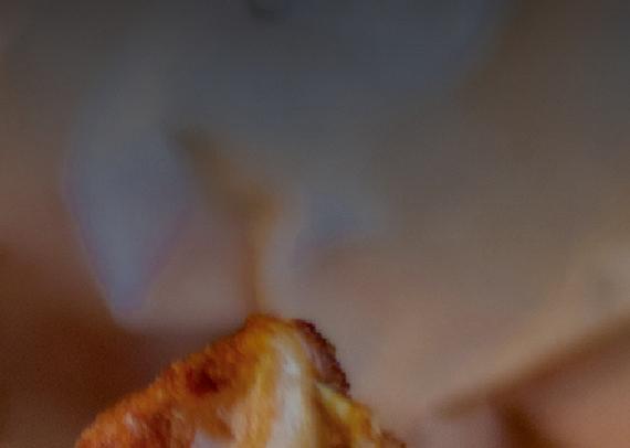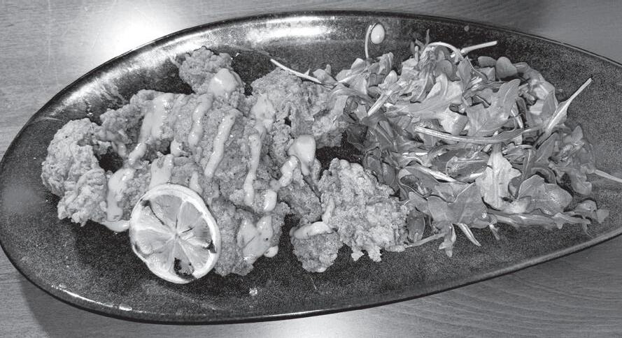 Chicken Flatbread led o another evening. Presented on an oval board, the crust hosts pieces of lightlycrusted fried chicken breast meat interspersed with small smoked heirloom tomatoes. All that is lightly sprinkled with smoked Gouda cheese, topped with arugula dressed in a light vinaigrette. The chicken and cheese flavors are commendable, but the crust itself merits special praise.