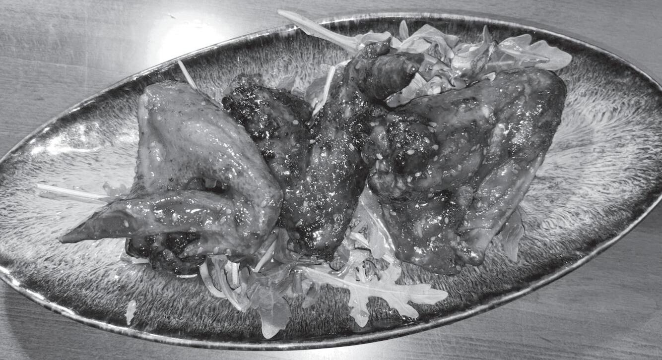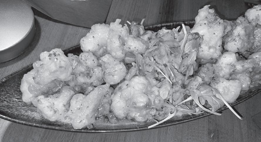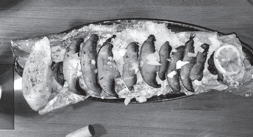 The menu o ers about a half dozen steaks and chops. My wife chose the small Filet Mignon (there’s a choice of 8- or 10-ounce sizes). Ordered medium, it came out well done (gray throughout). We returned it, and a graciously provided replacement was cooked to just the right temperature, yielding solid depth of beef flavor from within tender texture. This is served on a bed of lightly dressed arugula. We also ordered a side of garlic mashed potatoes and found them well-balanced.