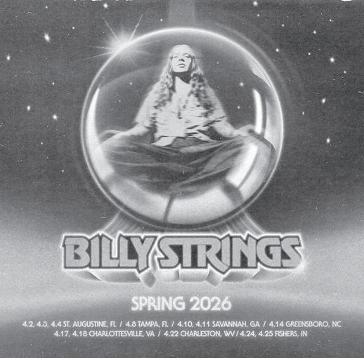 11 Two-time Grammy Award-winning singer, songwriter and musician BILLY STRINGS will extend his headline tour through the spring, including an April 14 show at Greensboro’s First Horizon Coliseum.