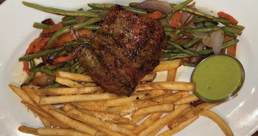 From five meat entrees, we went with Churrasco Grilled Steak. Skirt steak arrived cooked precisely to the ordered temperature, presented over roasted green beans, mushrooms, onions, and carrots. Crisp French fries complete the assembly. Chimichurri sauce — finely chopped parsley, garlic, and oregano, blended with olive oil and vinegar — is provided on the side.
