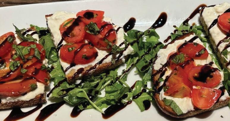 one meal with Bruschetta, the tomato slices augmented with arugula, basil, and extra virgin olive oil, all drizzled with balsamic glaze. Flatbread hosts Italian sausage, dabs of creamy-soft burrata cheese, as well as pickled/ preserved peppers and onions, supplemented by pesto sauce, plus mozzarella and parmesan cheeses. Both were quite enjoyable.