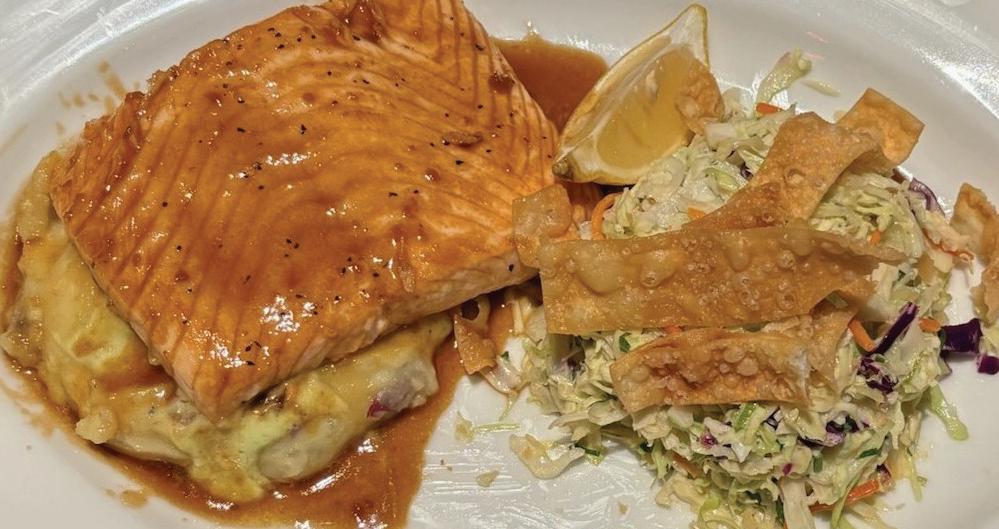 soy-ginger glaze, plated over wasabi-buttered mashed potatoes and slaw of green and red cabbage with slivered carrots. Crisp wontons provide a bit of decoration as well as crunch.