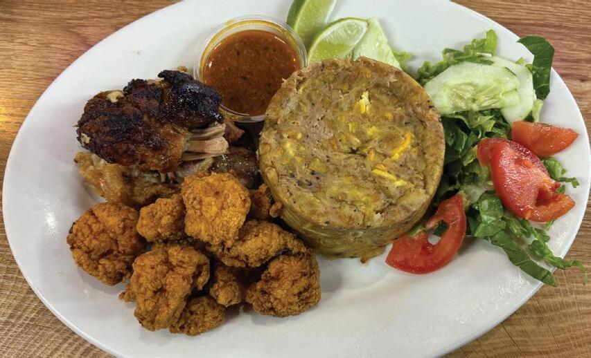 Yaroa is a Dominican street food, consisting of layers of fried plantains, plus chicken and melted cheese, streaked on top with ketchup and mayonnaise, producing a colorful, flag-like appearance. (You can substitute French-fried potatoes for plantains.) I had some di culty with this. The ketchup and mayonnaise flavors overwhelm the other ingredients. Underneath, though, there is a flavorful casserole, with tasty, tender baked chicken and melted cheese. And I liked the flavor of the plantains and the way they blended in. You might consider asking for a limited application of ketchup and mayonnaise and distribute it sparingly. Or you might like it the traditional way.
