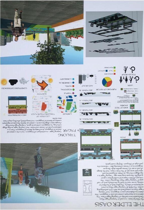 the elder oasis - is the park in tanjong pagar plaza. this location is in roof of tanjong pagar plaza. this district is an important commercial zone in singapore. and tanjong pagar plaza is a mixed land use with hdb and shopping centre. the hdb of tanjong pagar plaza is a main settlement of elderly. so we need to build up the elderly park on roof top of tanjong pagar plaza shopping centre. the concept of the elder oasis is let’s elderly have a good quality life. because long time ago. tanjong pagar is a big village in the bay. so water and grass become important materials of the elder oasis. and the design of park is use of chinese garden style. because singapore is a chinese community also. i referece the style of park is come from siheyuan - chinese countryards.