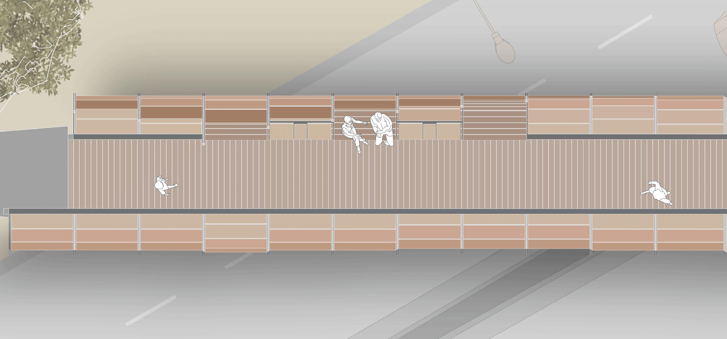 As it is located on a road island with an intersecting pathway, the building folds around itself to accommodate heavy foot and bicycle traffic. The integrated outdoor seating and height of the structure establishes the River Street Sanctuary’s courtyard as a rest stop, shielded from the commotion of the busy streets and city life surrounding it.