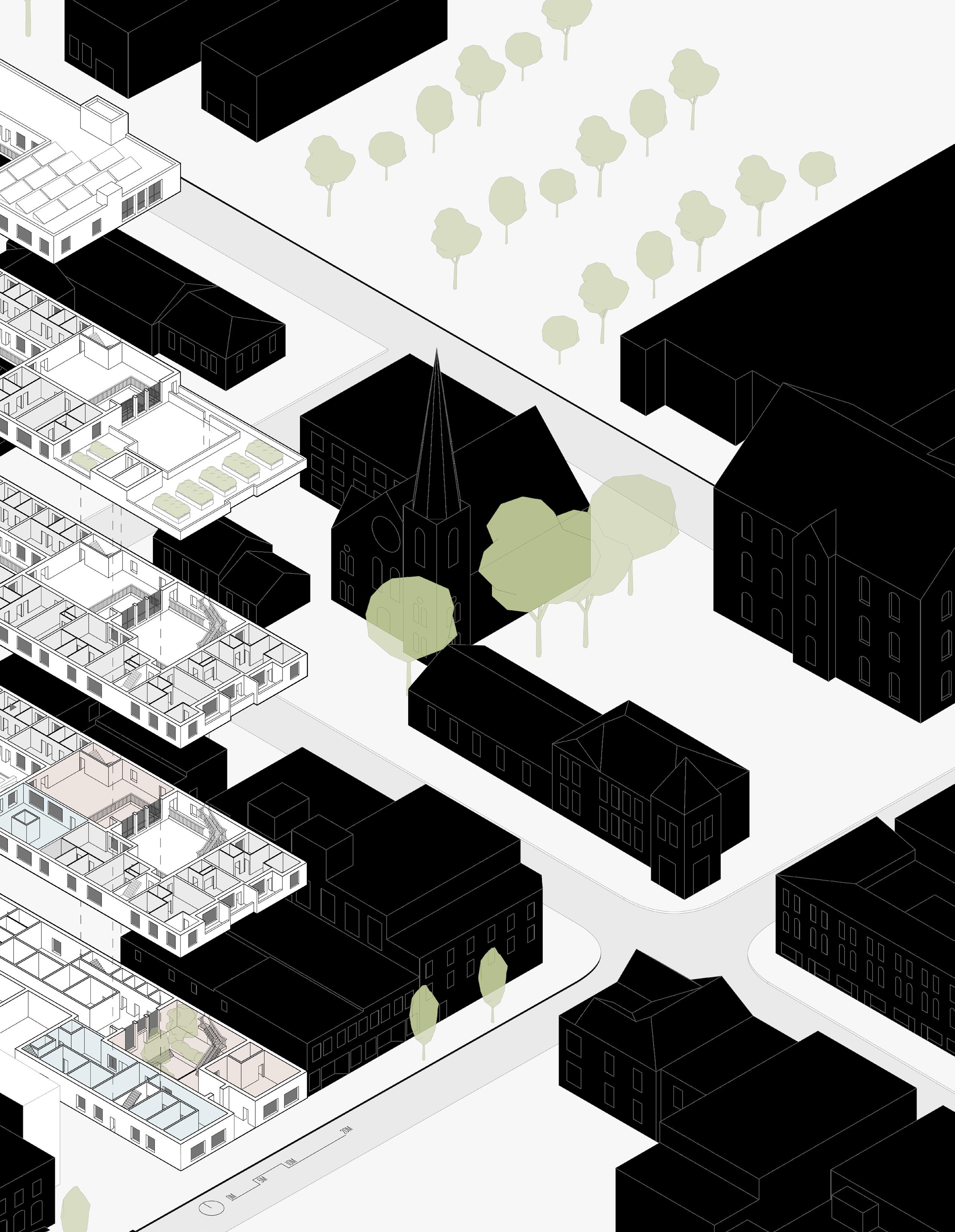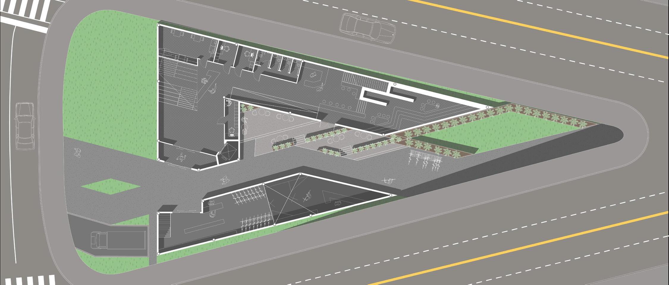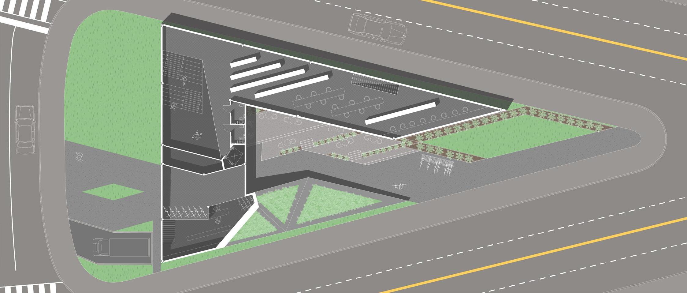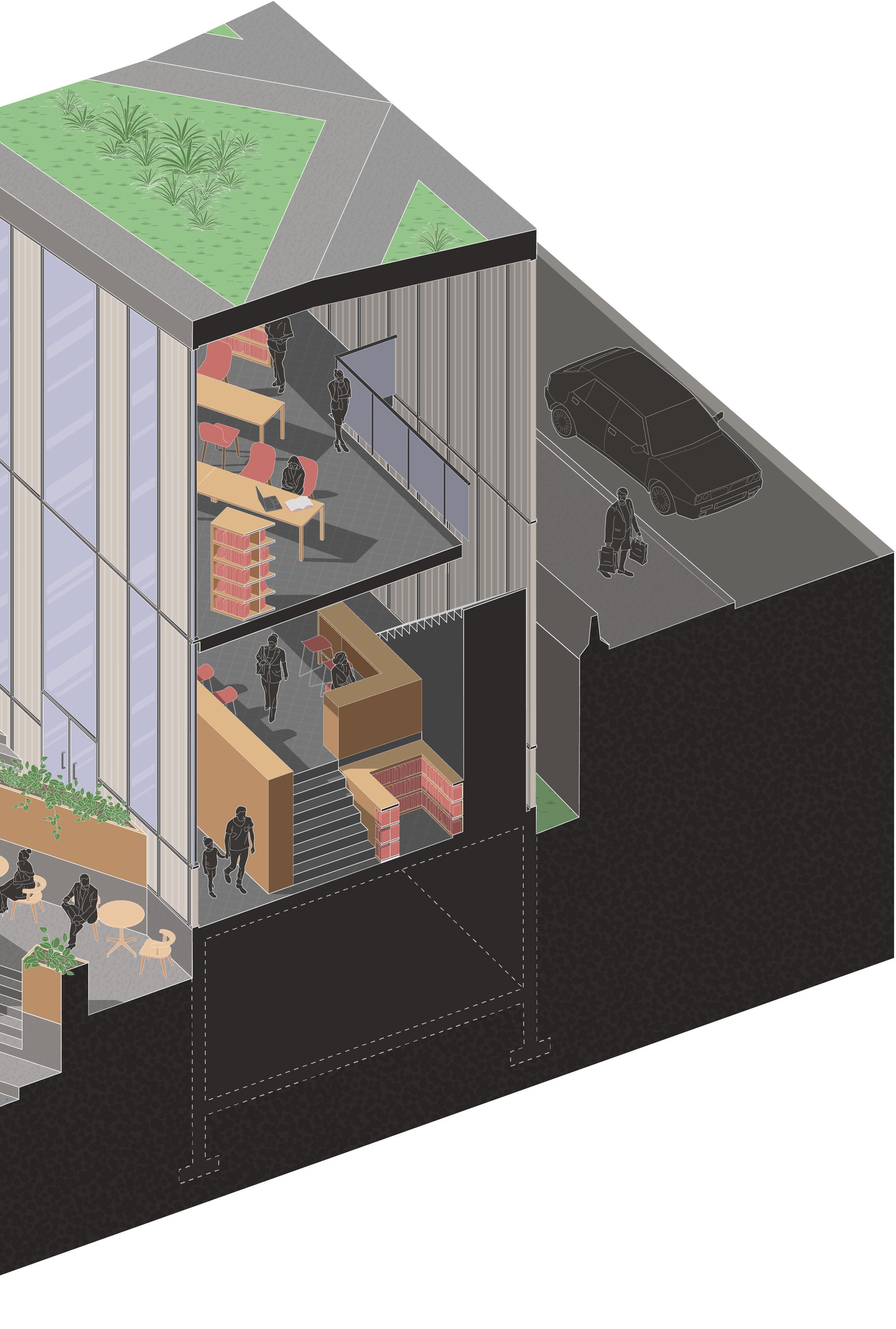 Located in the heart of the Toronto Corktown area, wedged between King St, Queen St, and River St sits a proposed active community hub. Designed to provide people with a peaceful work and study environment, as well as a split bike store and repair shop on the ground and basement floor which can facilitate learning the trade of repair for willing hobbyists.