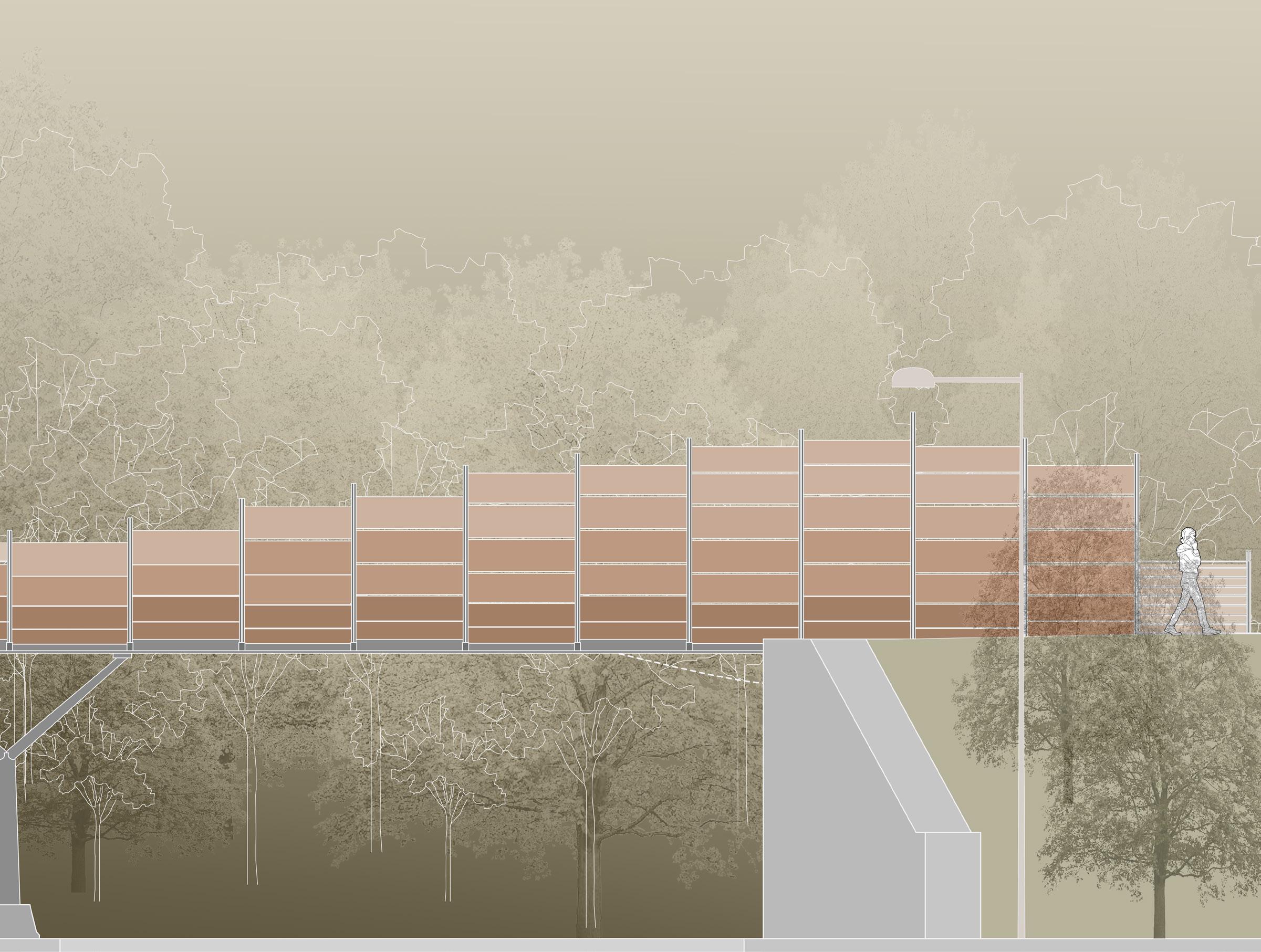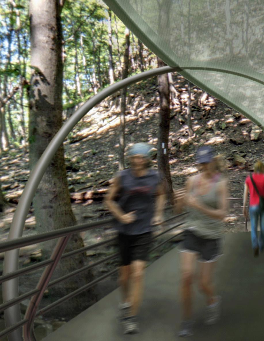 The Rail Trail Rest Stop is a steel pedestrian bridge crossing over Kenilworth Access of Hamilton Ontario. Joining the Hamilton escarpment rail trail, the bridge acts as a means of connection and a rest stop for local bikers and hikers.