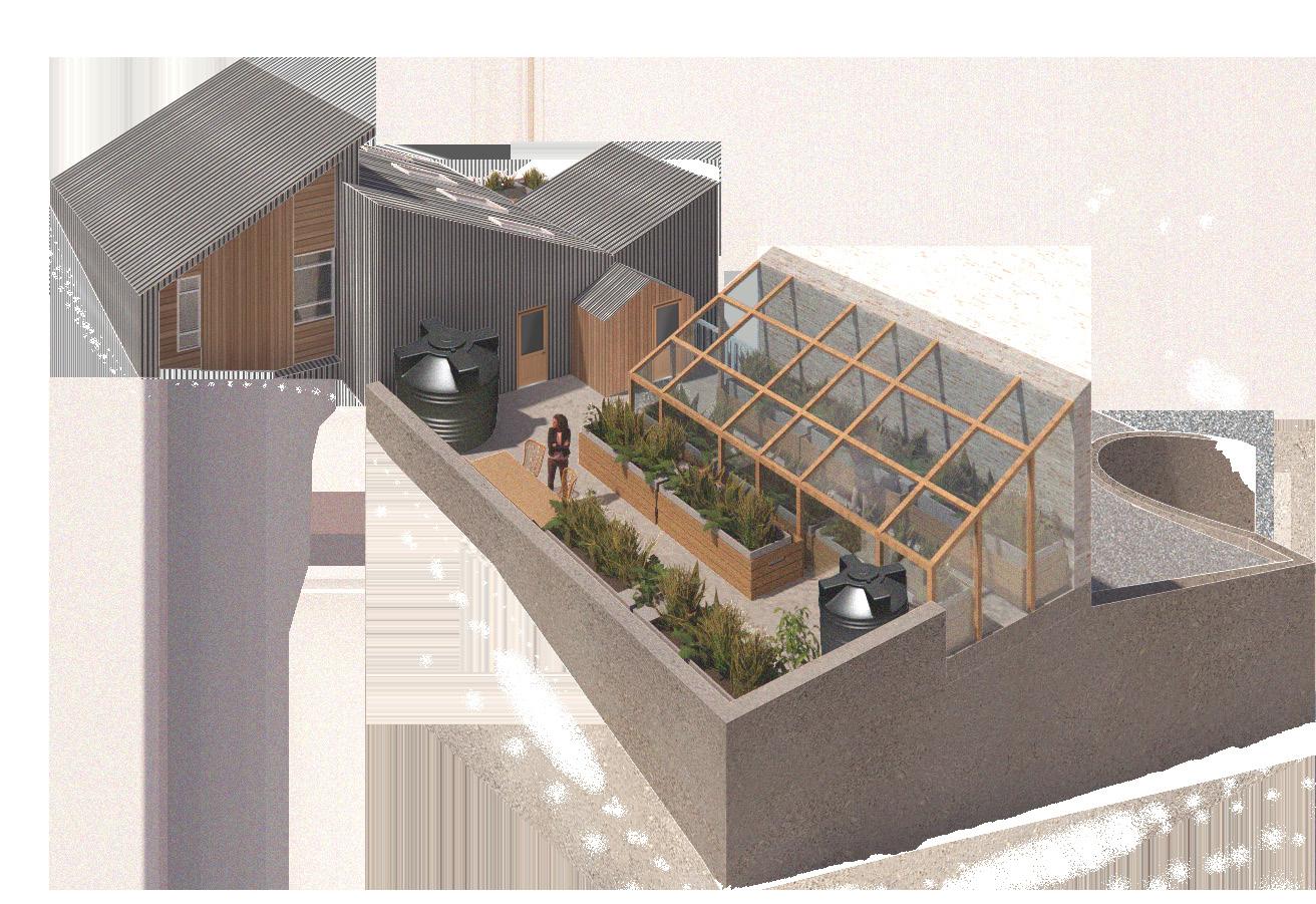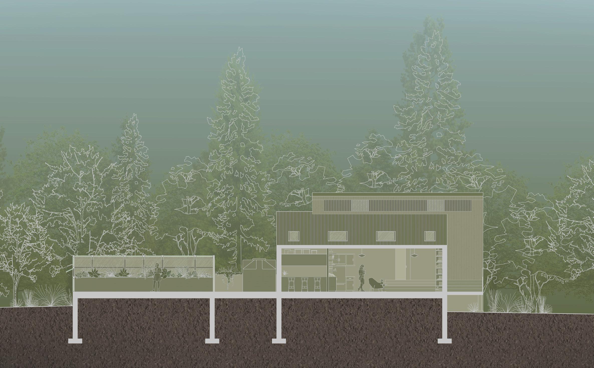 The Willis Point Oasis is a tiny house designed with sustainability in mind. Using locally sourced ecological materials, the home features programs tailored to the needs of two scientists participating in botanical studies. Located in a rural community on Willis Point in the Saanich Inlet, and backed by three protected forests the Oasis sits nestled in the hillside and faces the ocean waters. The building’s embodied carbon and ecological footprint is reduced by using green and reused materials (re-purposed steel, downed wood, reclaimed brick, and hemvrete).