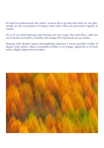It’s hard to understand, but what I want to do is go beyond what we see physically, to the conception of shapes and colors that are presented vaguely in nature. It’s as if we tried opening and closing our eyes super fast and then, with our eyes closed, we tried to visualize the image left imprinted on our retina. Playing with shutter speed and applying exposure I create parallel worlds of shapes and colors, where sometimes reality is no longer apparent or at least only a slight impression remains.