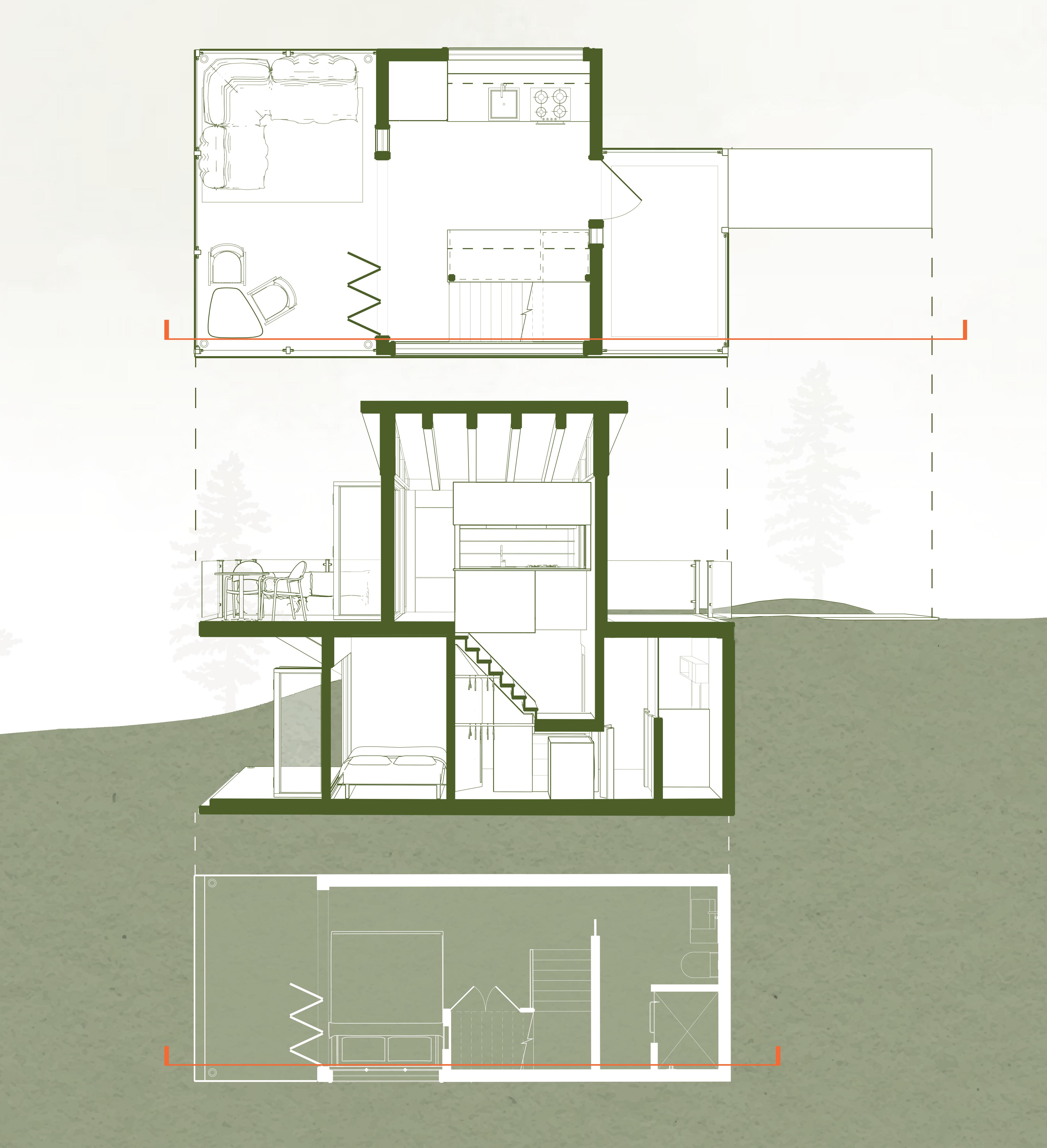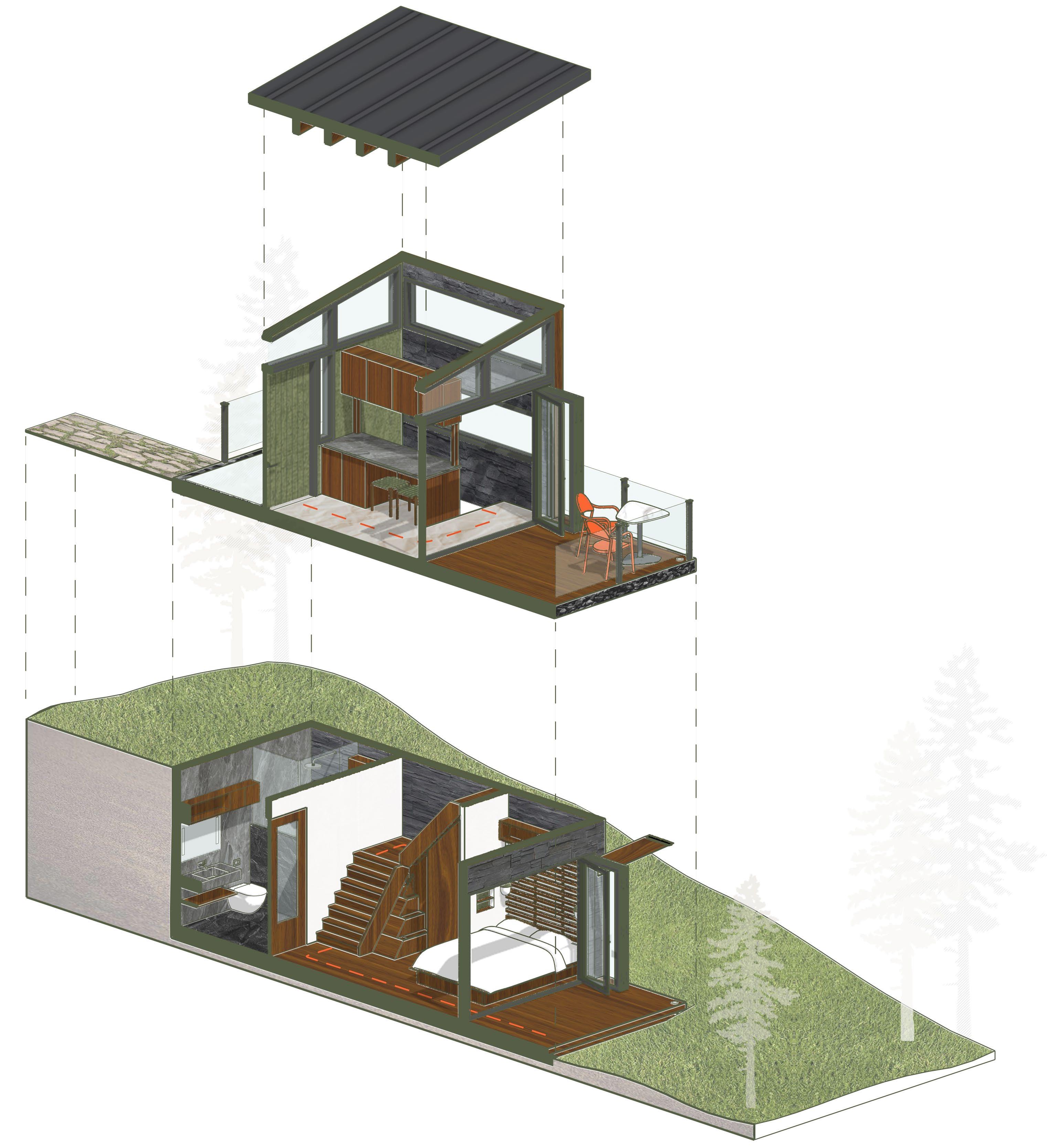 The restraints of this project required a tiny house with a ground floor plan of less than 300 square feet and the overall height of the structure to be at most 20 feet tall. I envisioned this home as a vacation or rental property, but with all the luxuries of modern daily living if someone wanted to live there full time. I wanted it to feel like a private getaway in the trees and have the house be an experience in itself. Limiting the size of the structure reduces the negative impact on the environment while the user can still enjoy the surroundings.