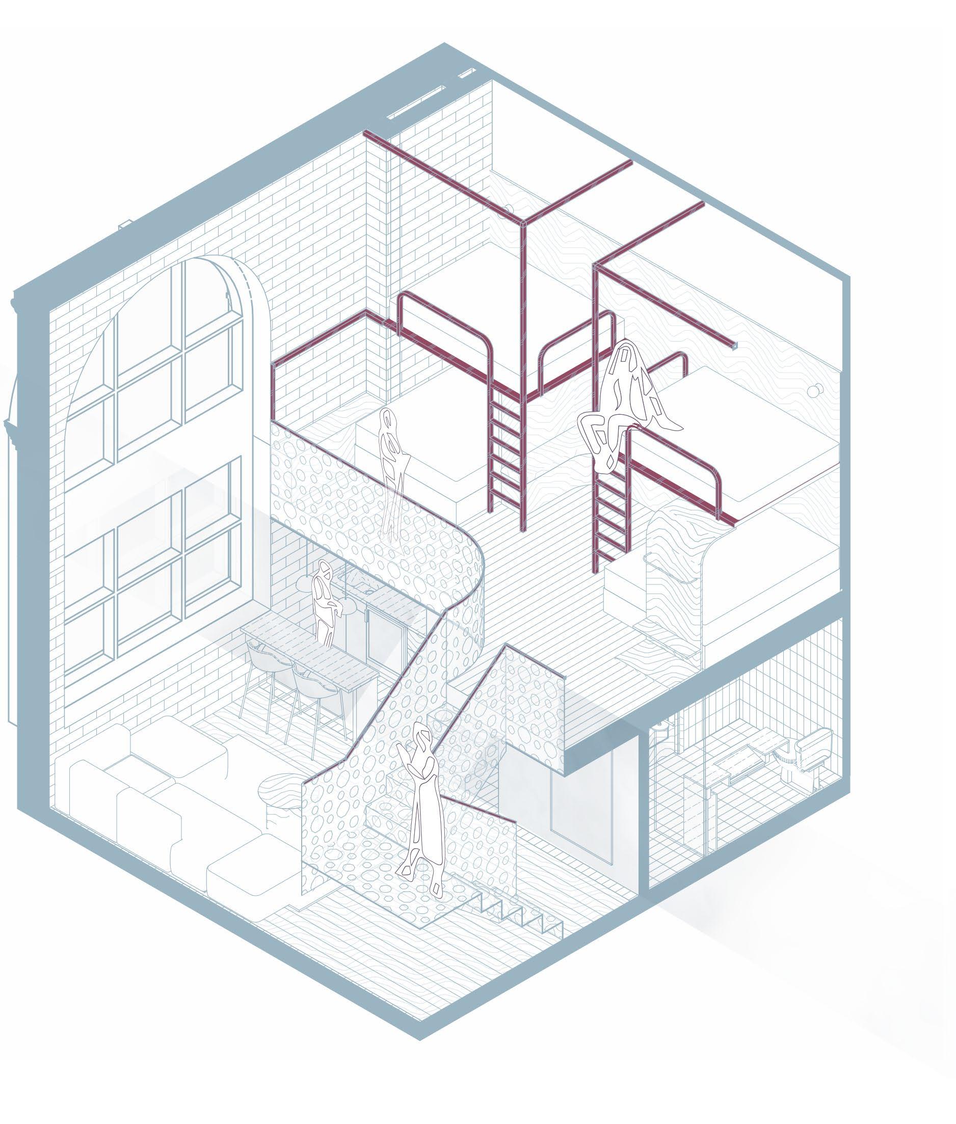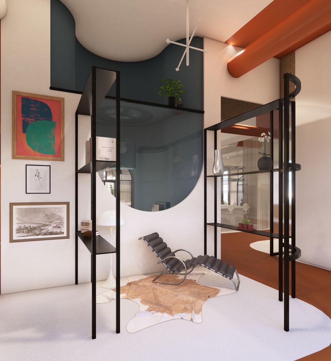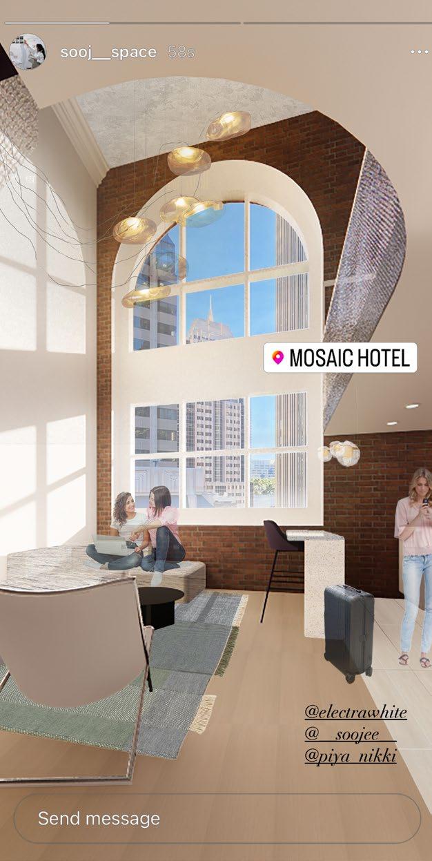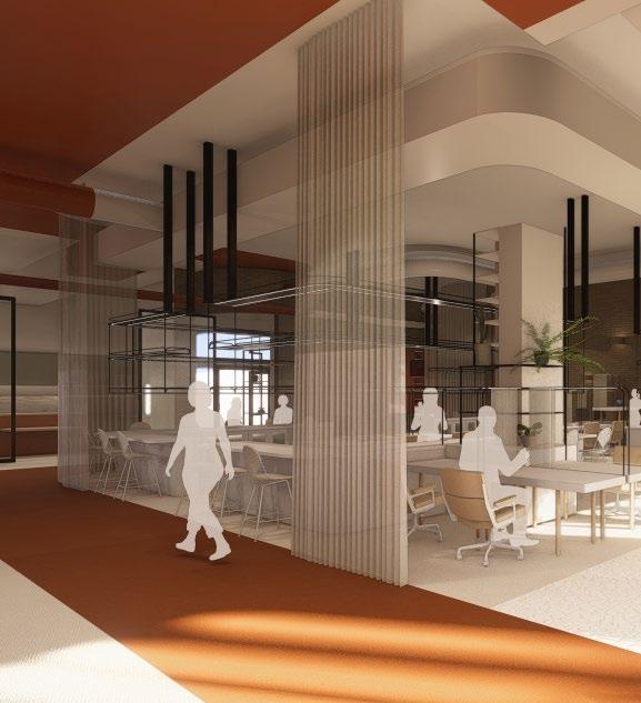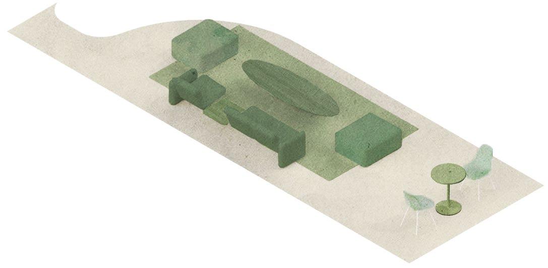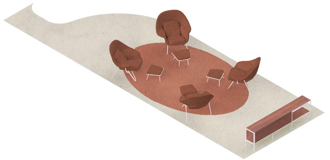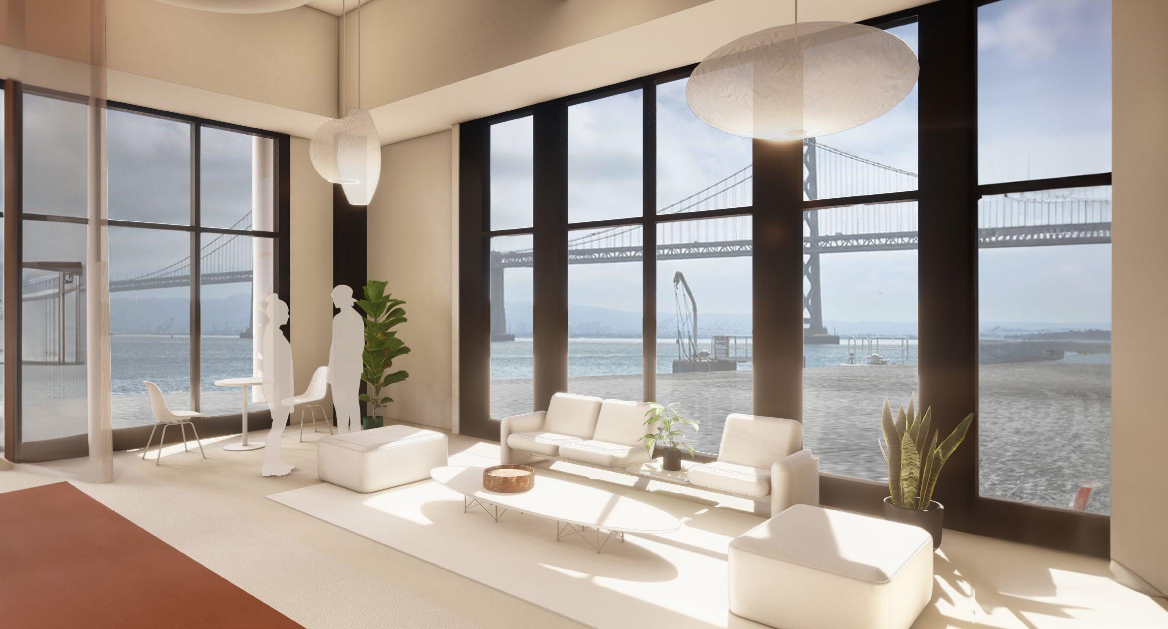 The front features a small storefront dedicated to vintage furniture from local sellers, closed off during office hours for a professional setting and seamlessly integrated after 5. Connected by a visually striking red path inspired by the Golden Gate Bridge, it guides visitors from the ferry building, emphasizing the curated vintage pieces.