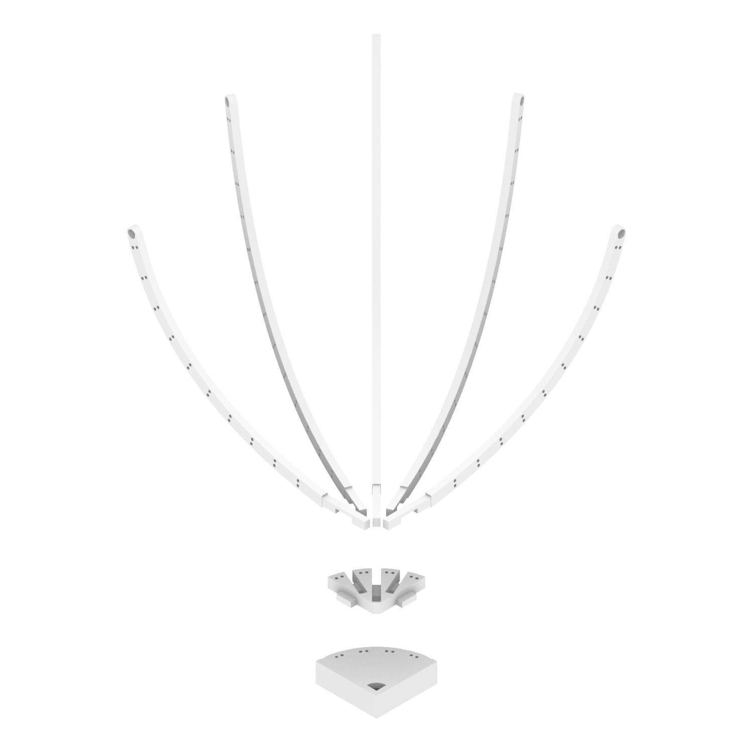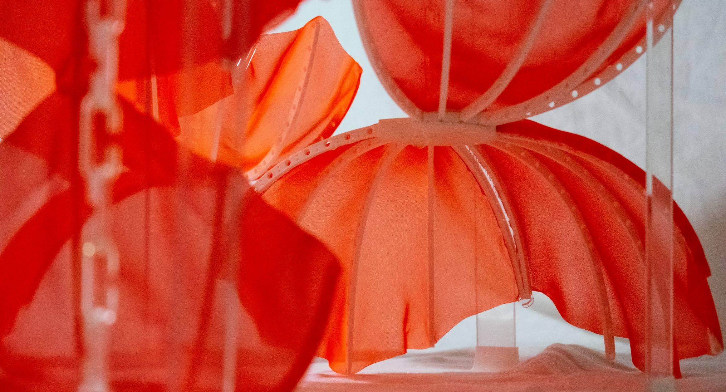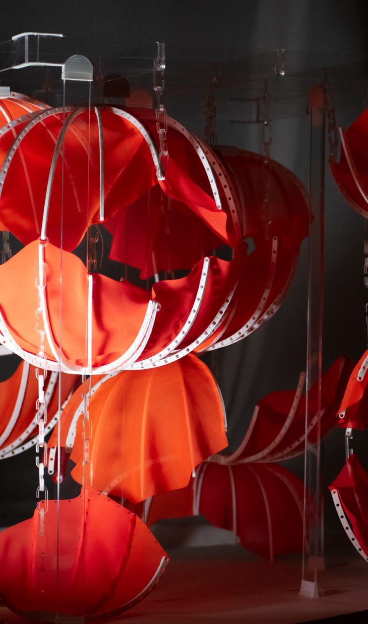 In the physical model the delicate fabric is supported by a 3D-printed frame that only uses joinery to connect the frame segments. Each unit is then suspended on acrylic chains and structure for a weightless appearance.