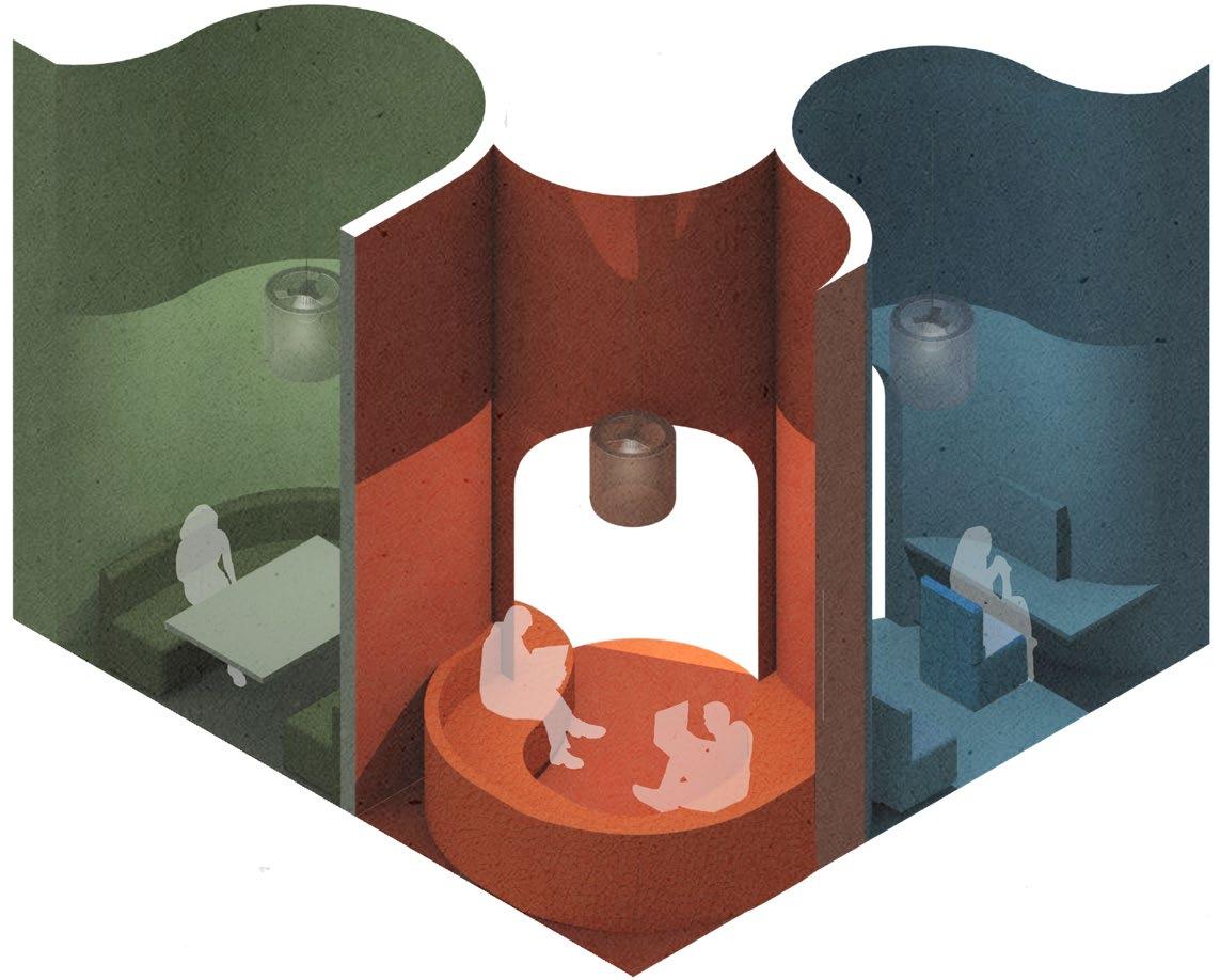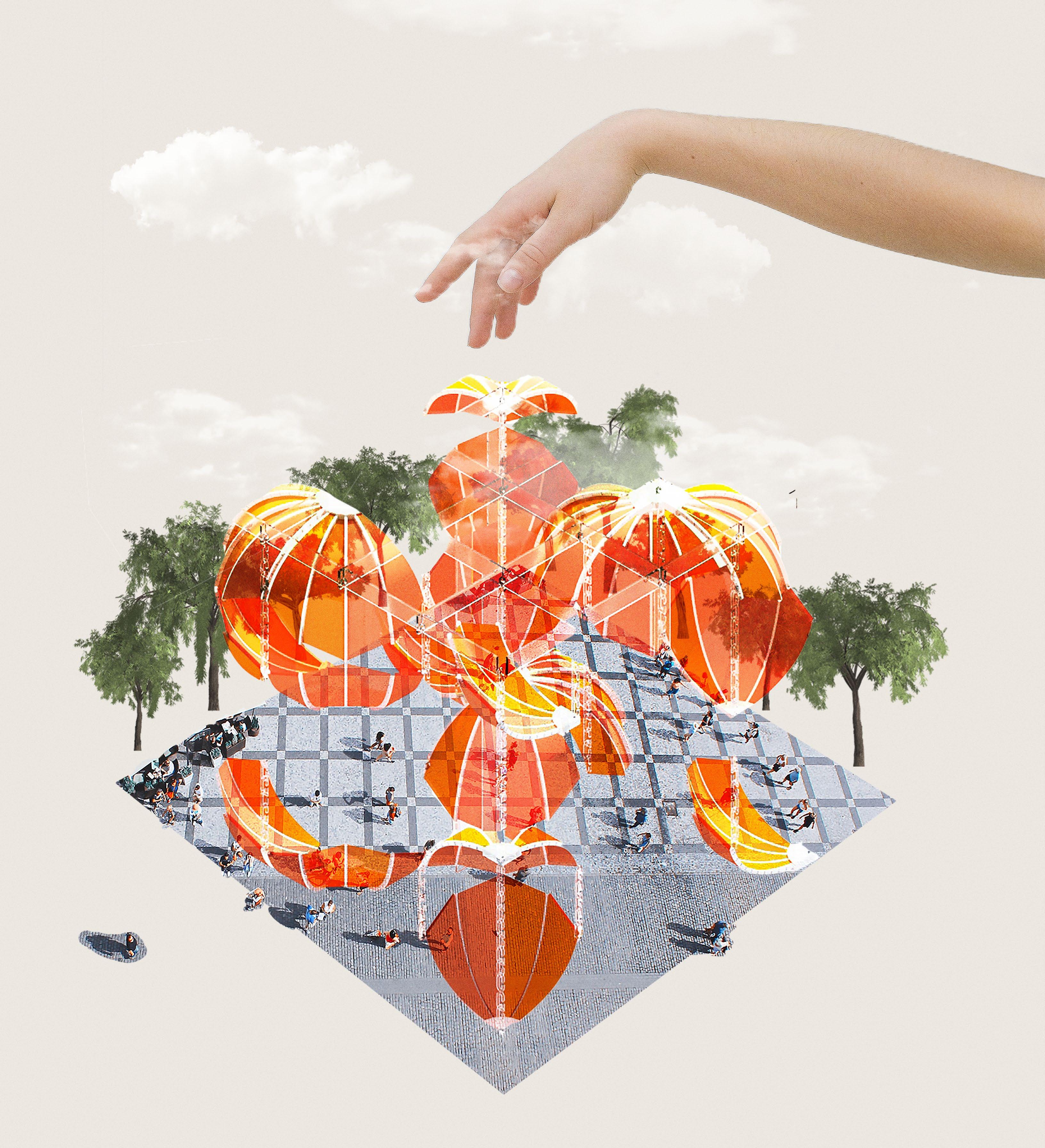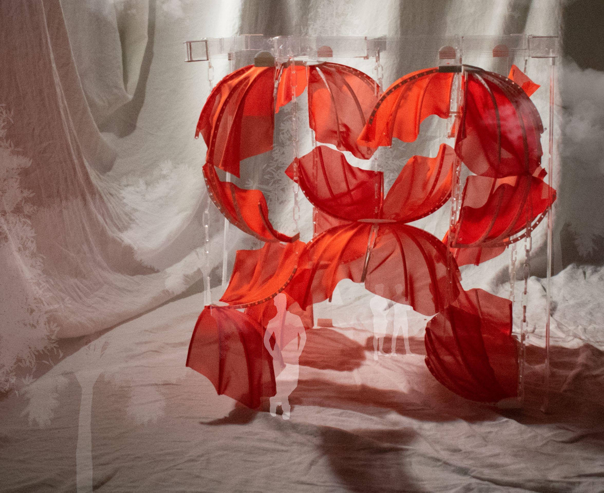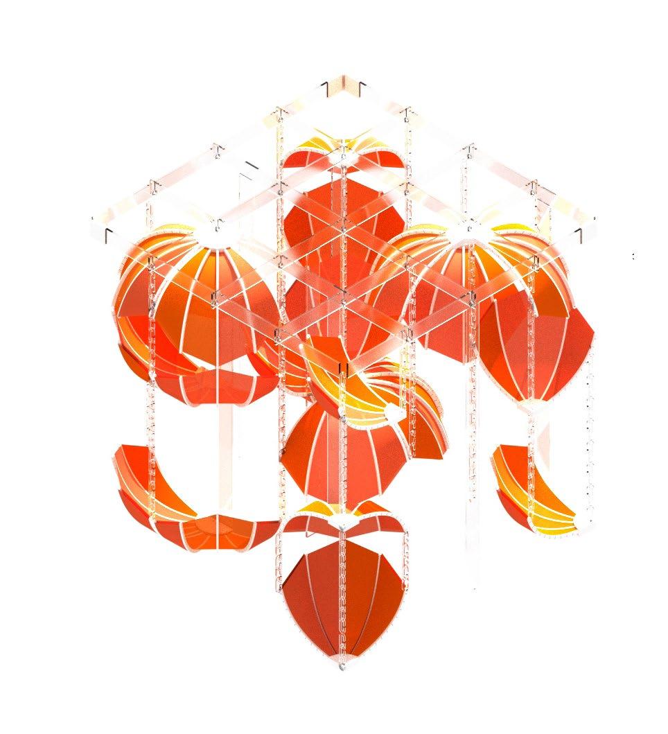 Falling petals converge to create an interactive, adaptable modular pavilion for any interior. Utilizing entirely 3D printed joinery, the design allows effortless disassembly for sustainable transportation. Assembled, the petals form a layered screen, facilitating an immersive experience with the interplay of air, light, and sound, making it a dynamic addition to diverse environments that can transform a space into an inviting, enveloping sanctuary or lively, engaging locale depending on the desired atmosphere.