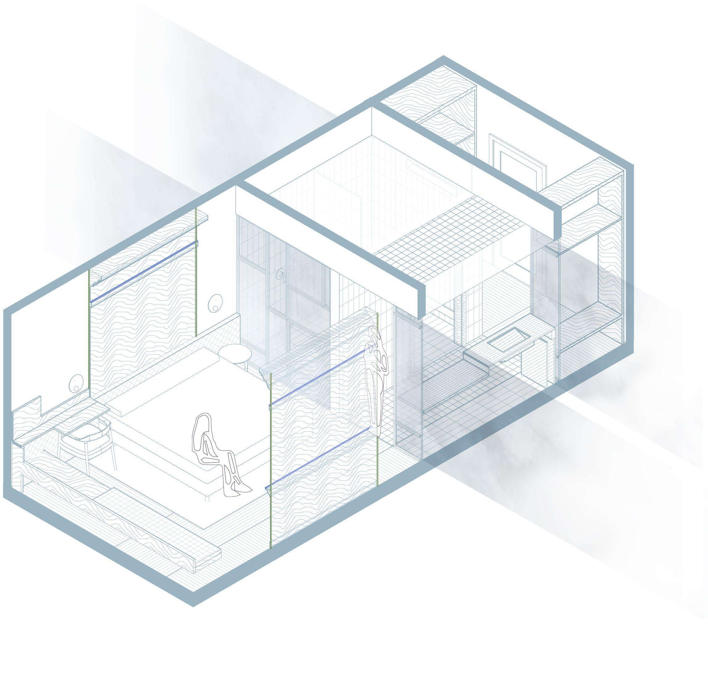 In the fog is the typical standard guest room, artfully designed to simulate the embrace of thick fog. The open bathroom mimics navigating through the mist, with a distinct path marked by changes in carpet direction and accent tiles.