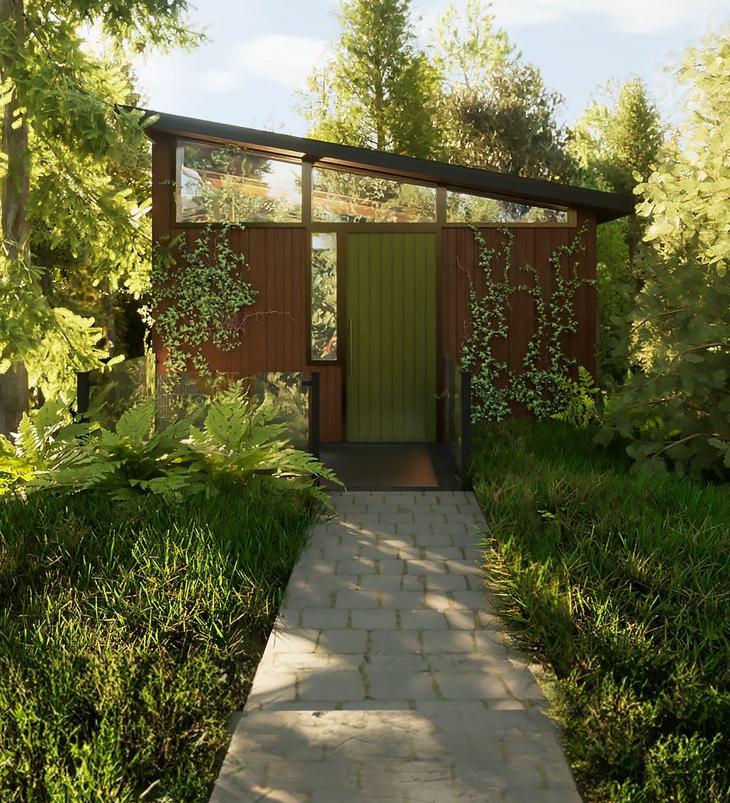 Skylight/Front Porch, 5. Vertical Cedar Planks - Siding & Ceiling Finish, 6. Soapstone Quartz - Counters & Wall Finish, 7. Matte Ceramic Tile - Bathroom Tile, 8. Walnut Veneer - Millwork Finish