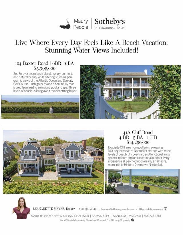 MAURY PEOPLE SOTHEBY’S INTERNATIONAL REALTY | 37 MAIN STREET , NANTUCKET, MA 02554 | 508.228.1881 Each Office is Independently Owned and Operated. Equal Housing Opportunity. 508.680.4748 • bernadette@maurypeople.com • @bernadettemeyerack BERNADETTE MEYER, Broker