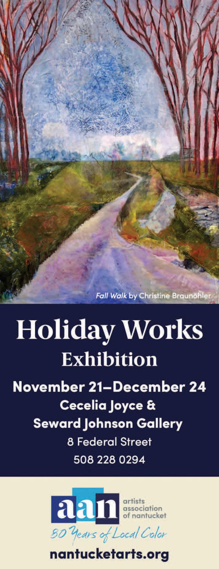 Join the Artists Association of Nantucket for a festive holiday art exhibit in the Cecelia Joyce & Seward Johnson Gallery at 8 Federal Street. Show continues through December 24. Nantucketarts.org