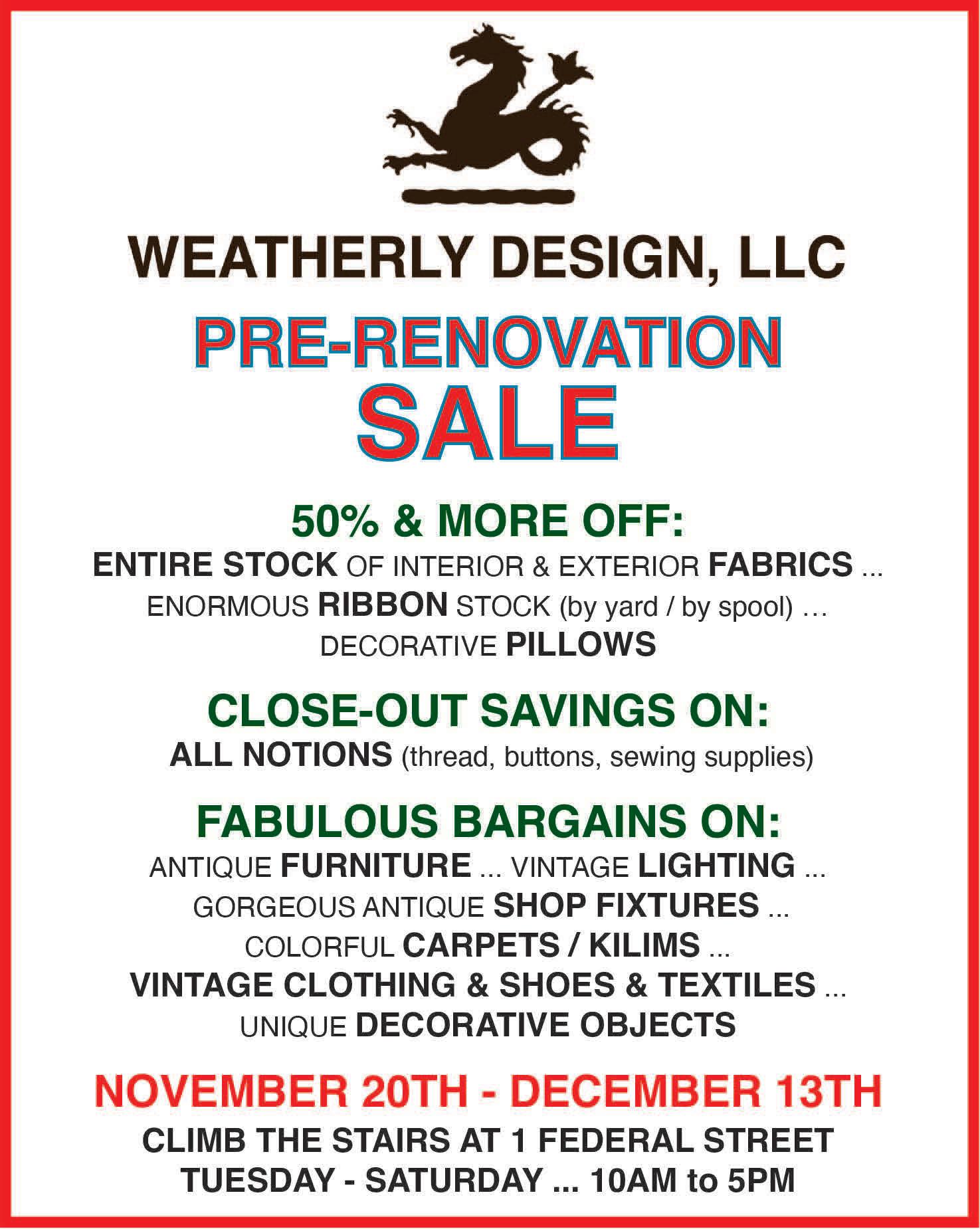 10 AM to 5 PM - Pre-Renovation Sale in Weatherly Design 50% & more off Weatherly Designs’ entire stock of fabrics, enormous selection of ribbons, decorative pillows, & all notions. Fabulous bargains on antique furniture, vintage lighting, carpets, textiles. Upstairs at 1 Federal St. Sale thru Dec. 13.