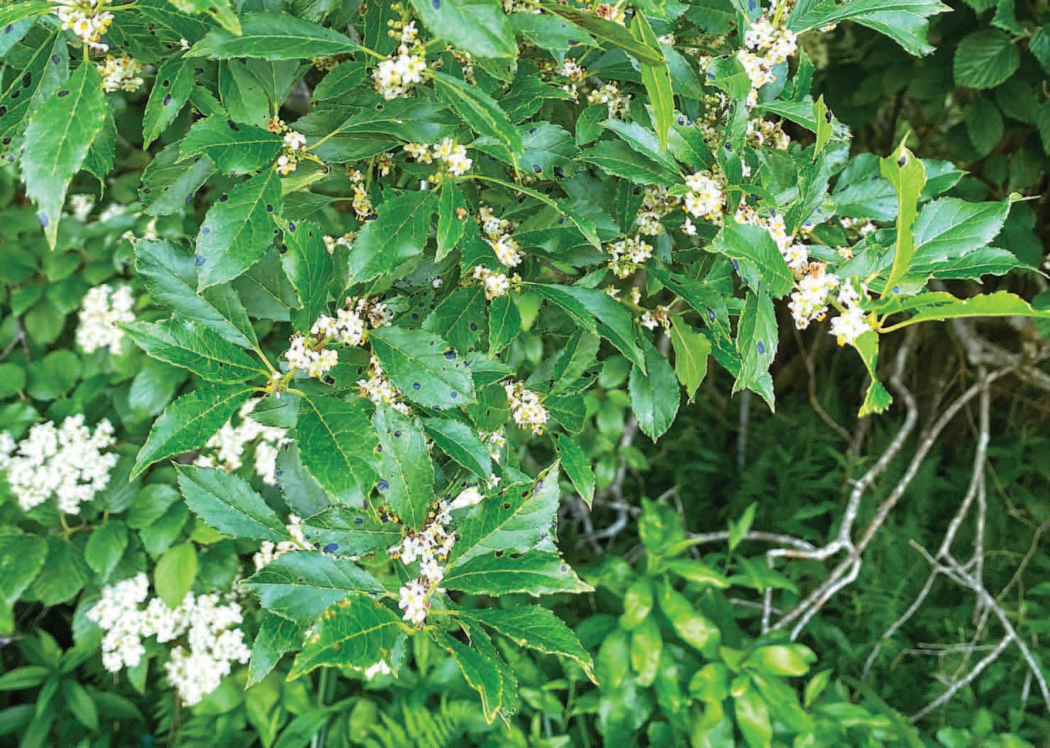 Winterberry is a member of the holly family, but, unlike other members of this family, the winterberry leaves are not pointed or evergreen. The white flowers in June are inconspicuous, and for most of the season you’ll see a dark green shrub with a decent height (generally 6-10 feet).