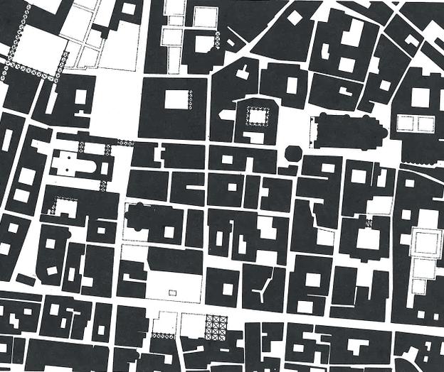 The central point of the text’s stance then emerges from this viewpoint – an understanding by the authors that “buildings and spaces exist in an equality of sustained debate.”7 What is meant by this is that the various binary positions Rowe and Koetter initially raise (object versus texture, figure versus ground, and so on) can in fact constitute parts within a continuous matrix (what the authors promote as bricolage), and in doing so, the void space can become an active, dominant element rather than subordinate to an adjacent solid figure. Whilst the argument posited by Rowe and Koetter was predicated on a broader pluralistic aspiration for recognising the city as a sum of heterogenous parts, the concept of ‘Urban poché’ is also of particular relevance to the study of the