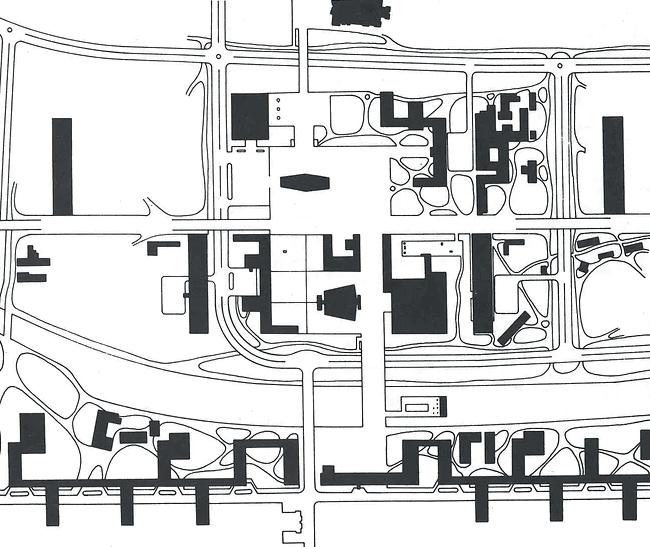 Presiding above all exploration of the void strategy conducted in this thesis is the theory of Colin Rowe and Fred Koetter in Collage City (1978). In Chapter 3 titled ‘Crisis of the Object: Predicament of Texture’, Several diptychs are depicted and examined through the lens of figure-ground.4 Most notably in a direct comparison between Le Corbusier’s Modernist plan for SaintDié and the traditional city layout of Parma (Fig. 1 and Fig. 2), the authors argue that both models, when read in this way, reveal conflicting spatial orders; Rowe and Koetter observe one city as “an accumulation of solids in largely unmanipulated void: and [the] other an accumulation of voids in a largely unmanipulated solid”, thus causing opposing interpretation of figure, “[…] in the one object, in the other space.”5