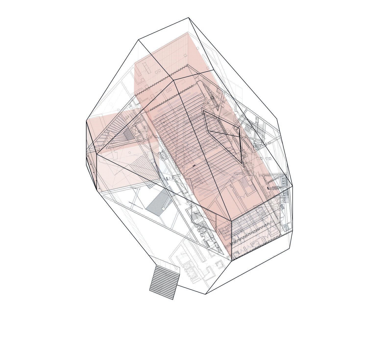 any external systems – to the extent that the polyhedral form of the building in many ways has a direct visual similitude with the solid/void diagram of functions generated by such as strategy.32