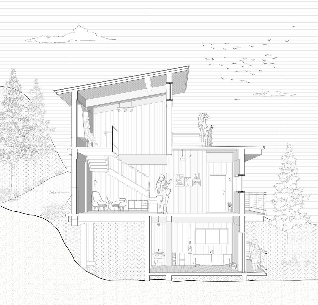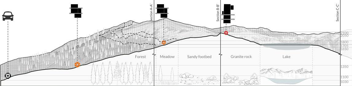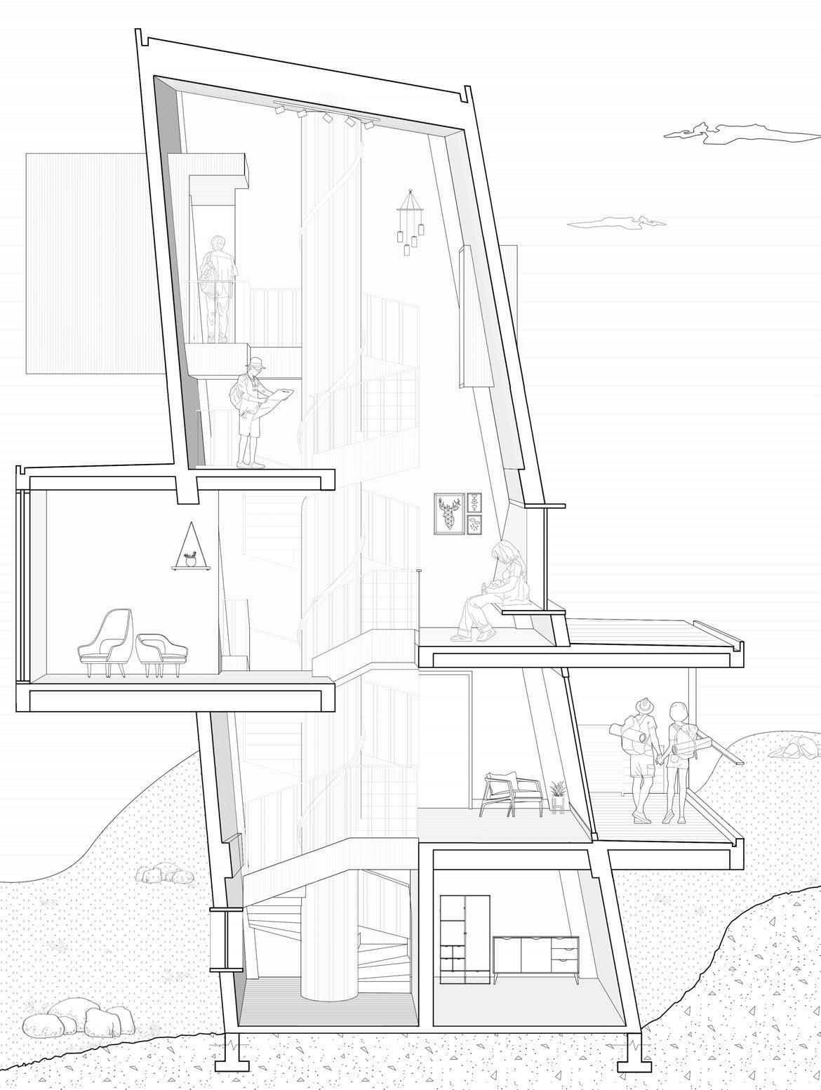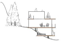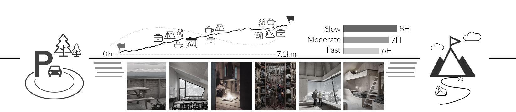 The site, located on a slope surrounded by trees and vegetation, positions the shelter away from the mountain to prevent debris. It offers hikers a scenic view and promotes sight interactions. With three levels providing various functions, different desires are considered for a better rest experience.