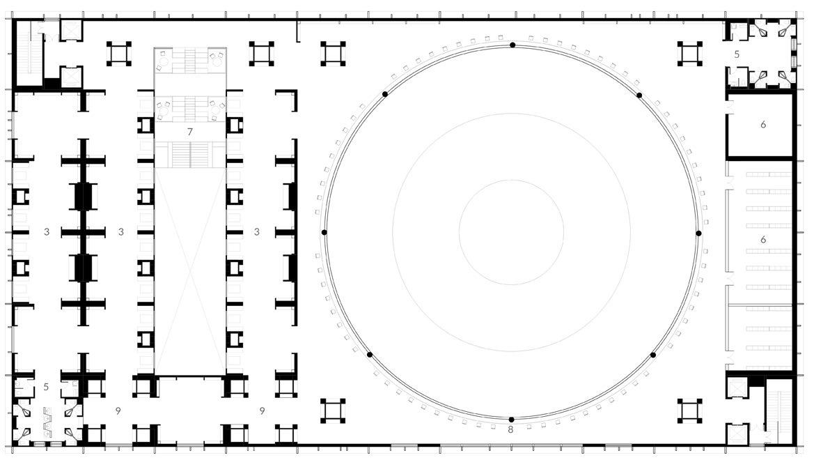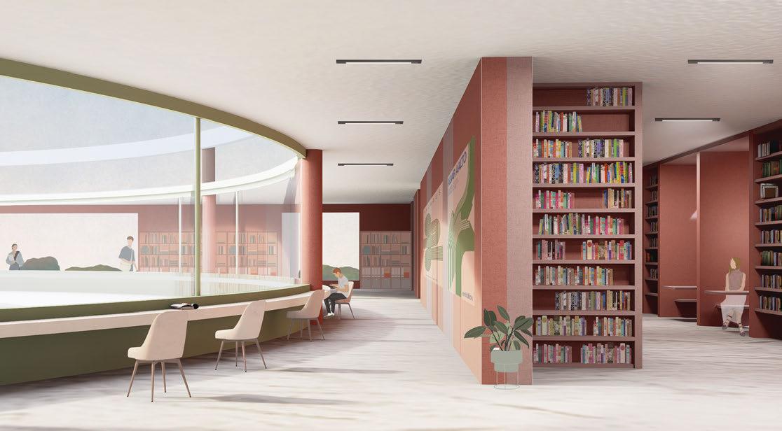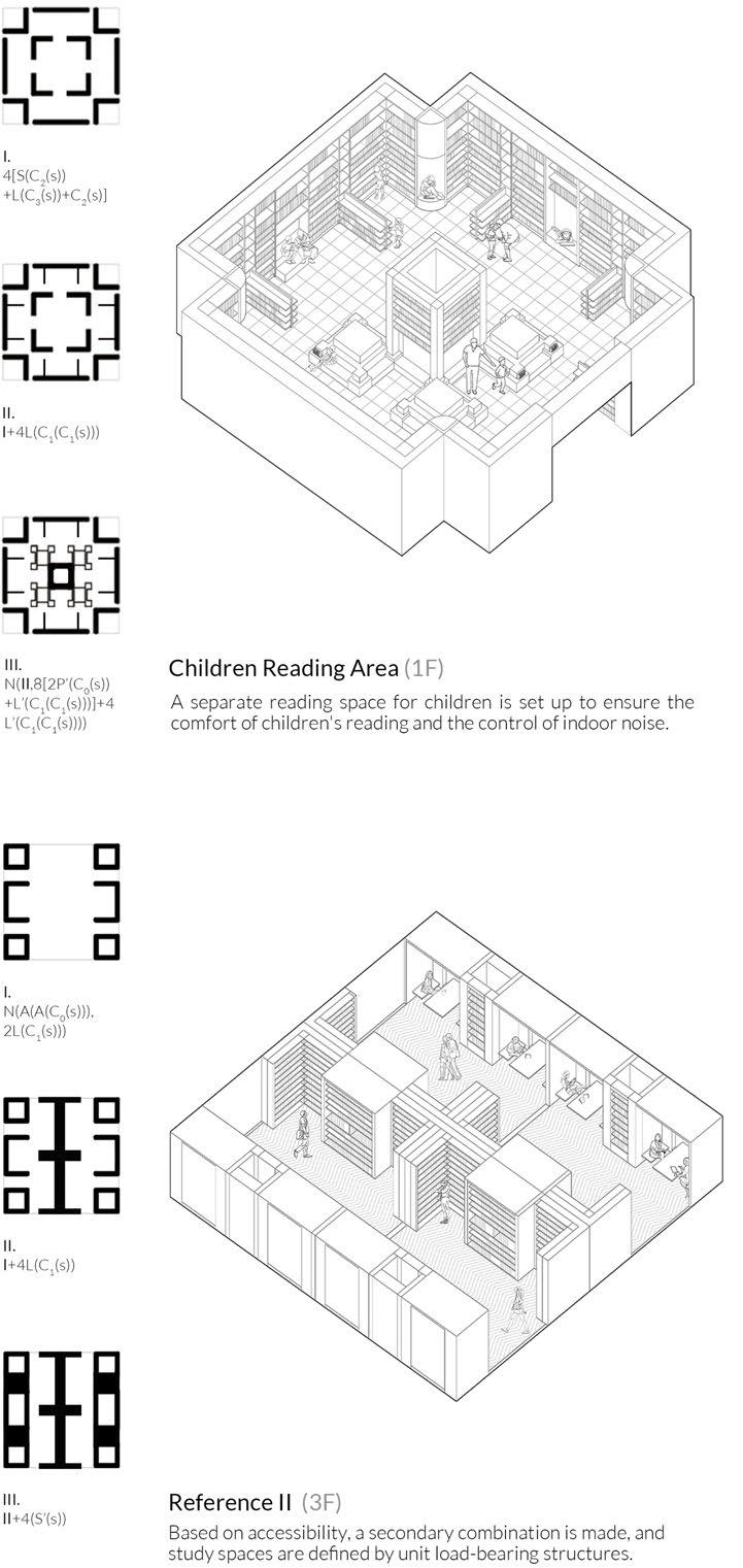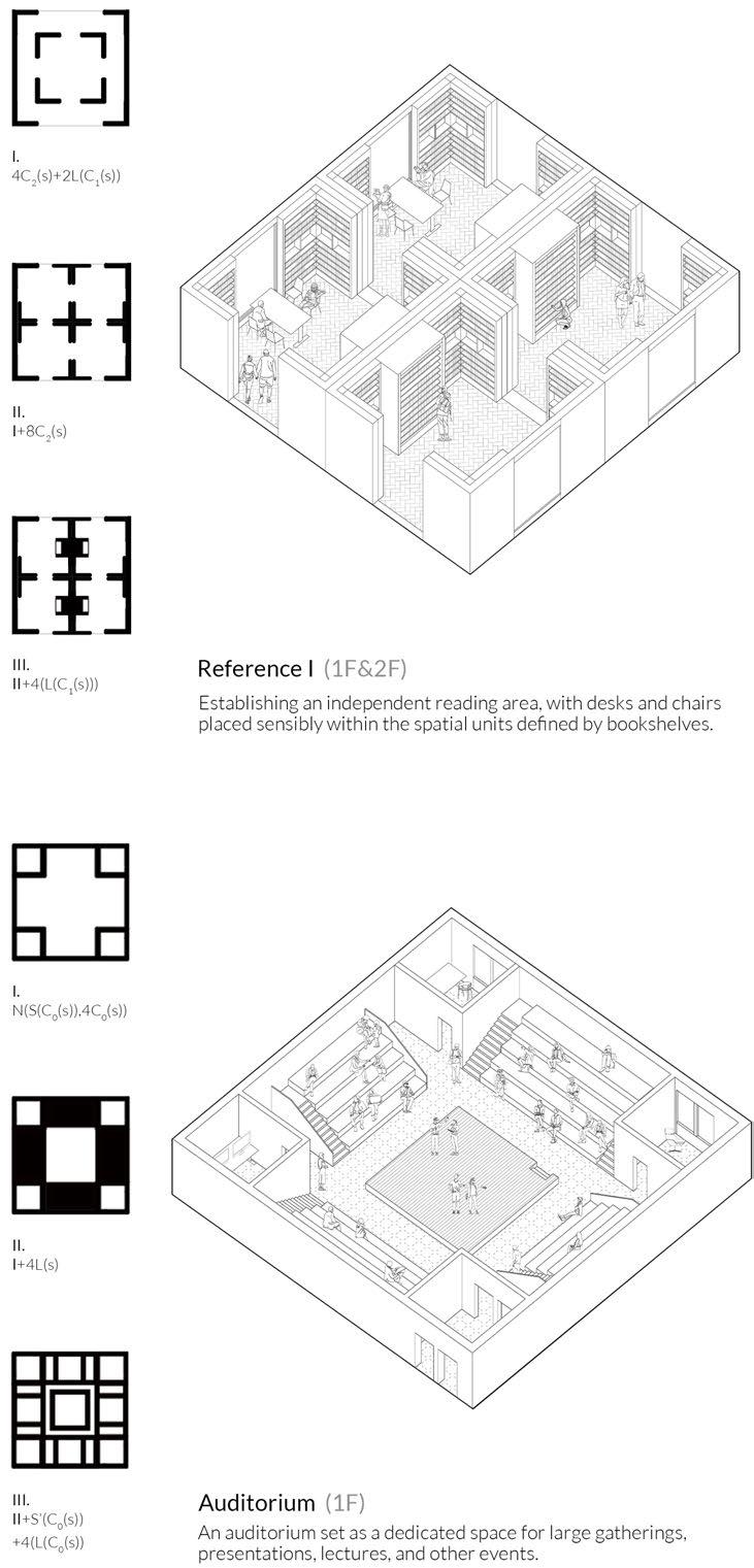 Stairs and restrooms are located in the corners for ease of use and transportation. The entrance is located on the south side, where the area is more open, while the north side is dominated by a more private reading area, providing an environment more conducive to reading.