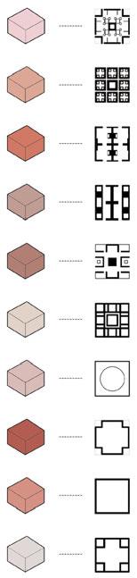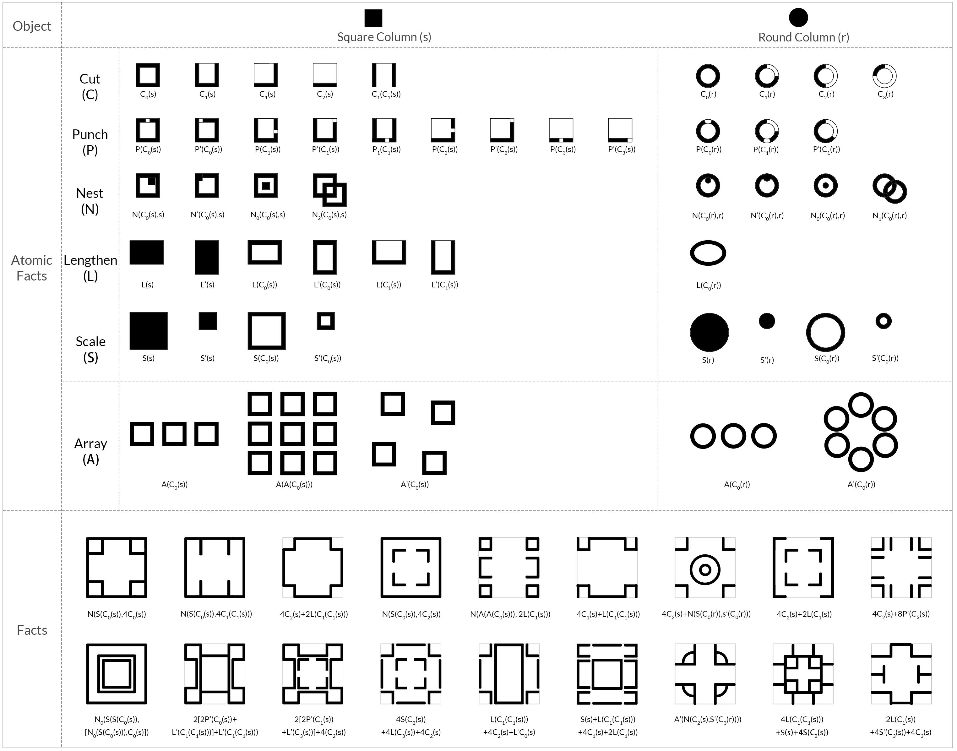 Drawing insights from classic cases, the ideal architectural grammar table was crafted. Selecting the ubiquitous square and circular "columns" as the foundational elements, six manipulation techniques – Cut, Punch, Nest, Lengthen, Scale, and array – were introduced to sculpt the "columns". This process led to the amalgamation of the resulting small space types (Atomic facts) to form intricate spatial compositions (Facts).
