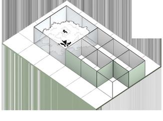 Residential modules are integrated around existing trees and shrubs, offering flexibility to expand or contract according to occupants' requirements. The layout of small modular frameworks aligns with the site's original trees and shrubs, divided by varying heights.