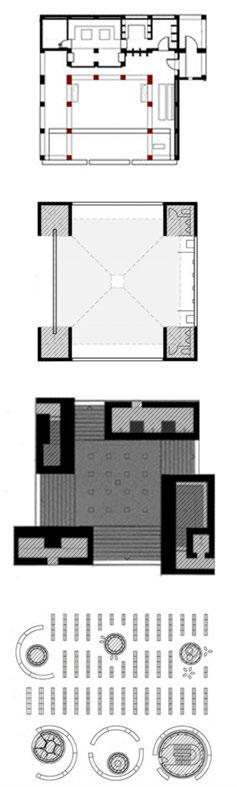 Square column with complex interior space Zumthor implanted many column-like entities into the overall plan, and by varying their internal forms, created architectural spaces with different functions and atmospheres.