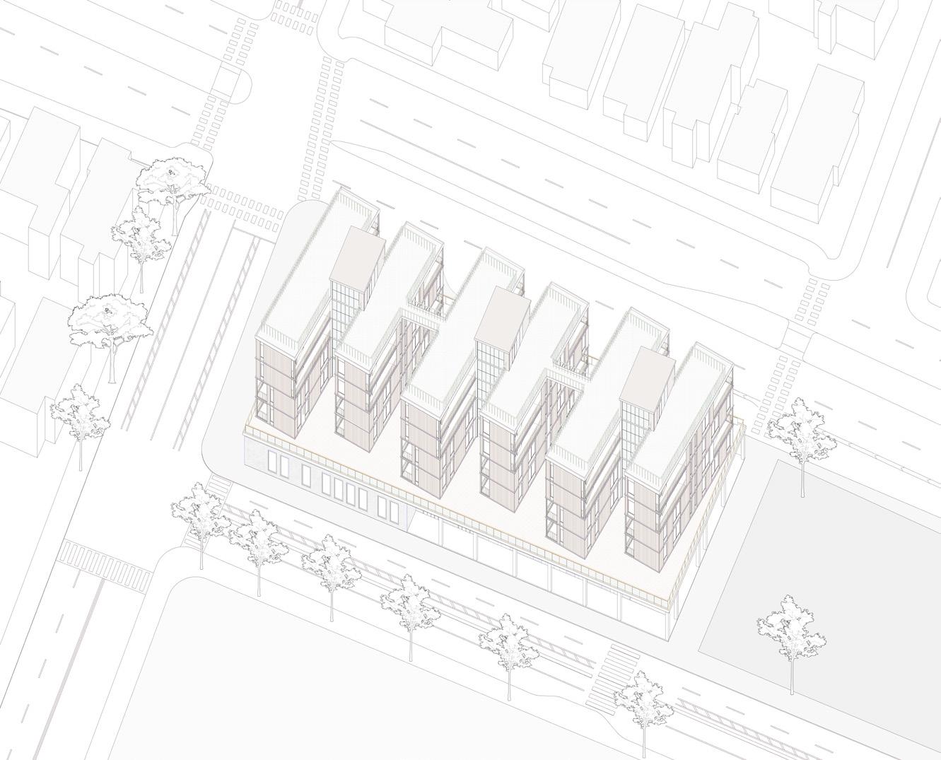 By aligning building volumes with existing street rhythms, the project embeds itself within the local grain rather than asserting a singular object condition. Open space becomes both an environmental device and a form of social infrastructure, structuring movement, visibility, and encounter.