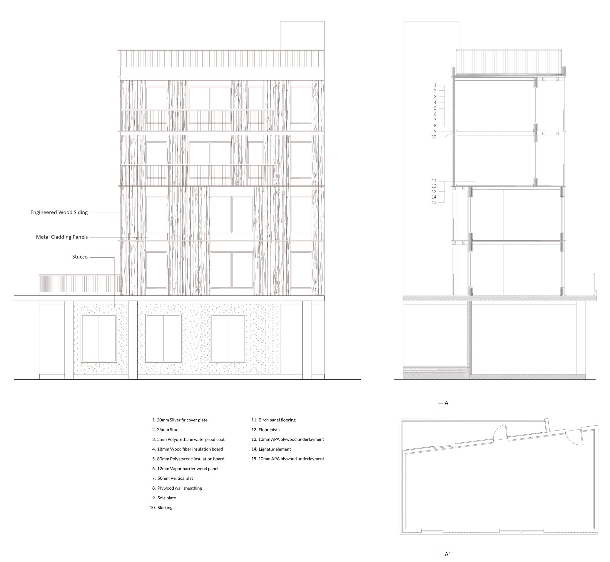 The design harmoniously blends natural and social interactions, forming a circular and aesthetically pleasing community. Stairs seamlessly connect the ground corridor to the living floors, allowing residents to navigate through the urban open space and wooded corridors, fostering