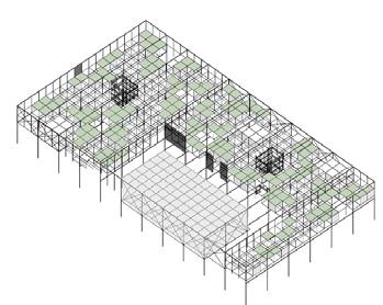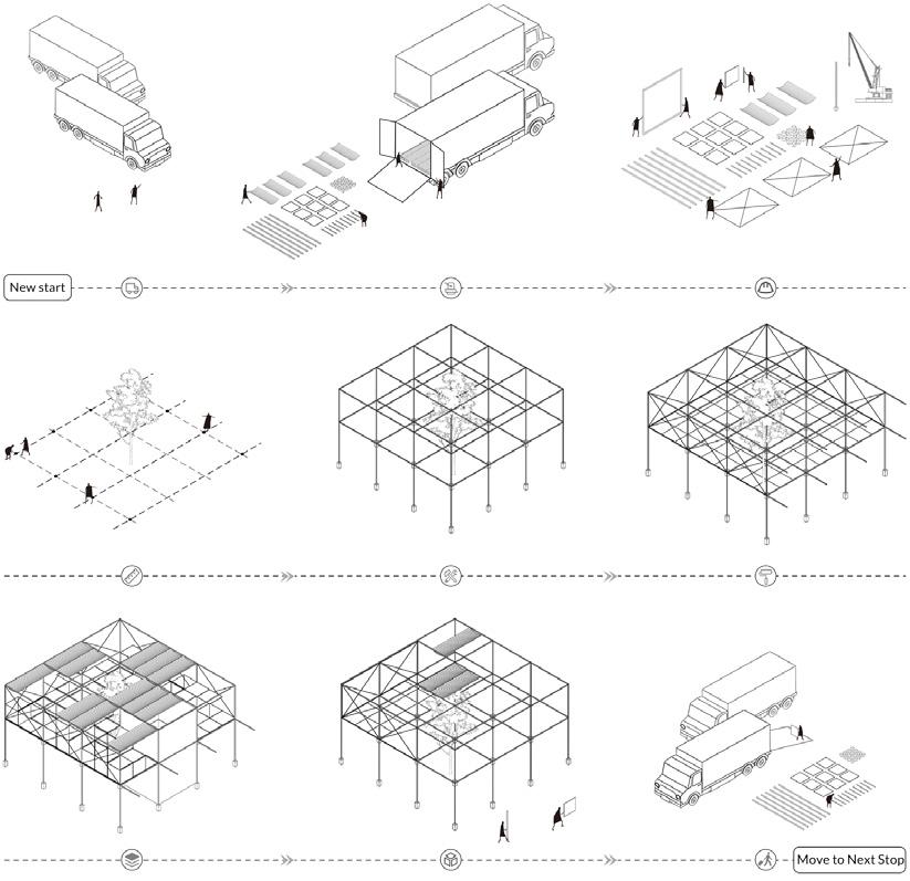 To improve construction efficiency and reduce environmental impact, we chose lightweight components as the primary building materials. These lightweight components not only make the settlement easy to assemble and dismantle quickly but also contribute to achieving sustainable goals through reuse. Additionally, we utilized translucent waterproof membranes as the top layer of cover to ensure ample natural lighting inside the building, effectively waterproof the structure, and enhance its durability and sustainability.