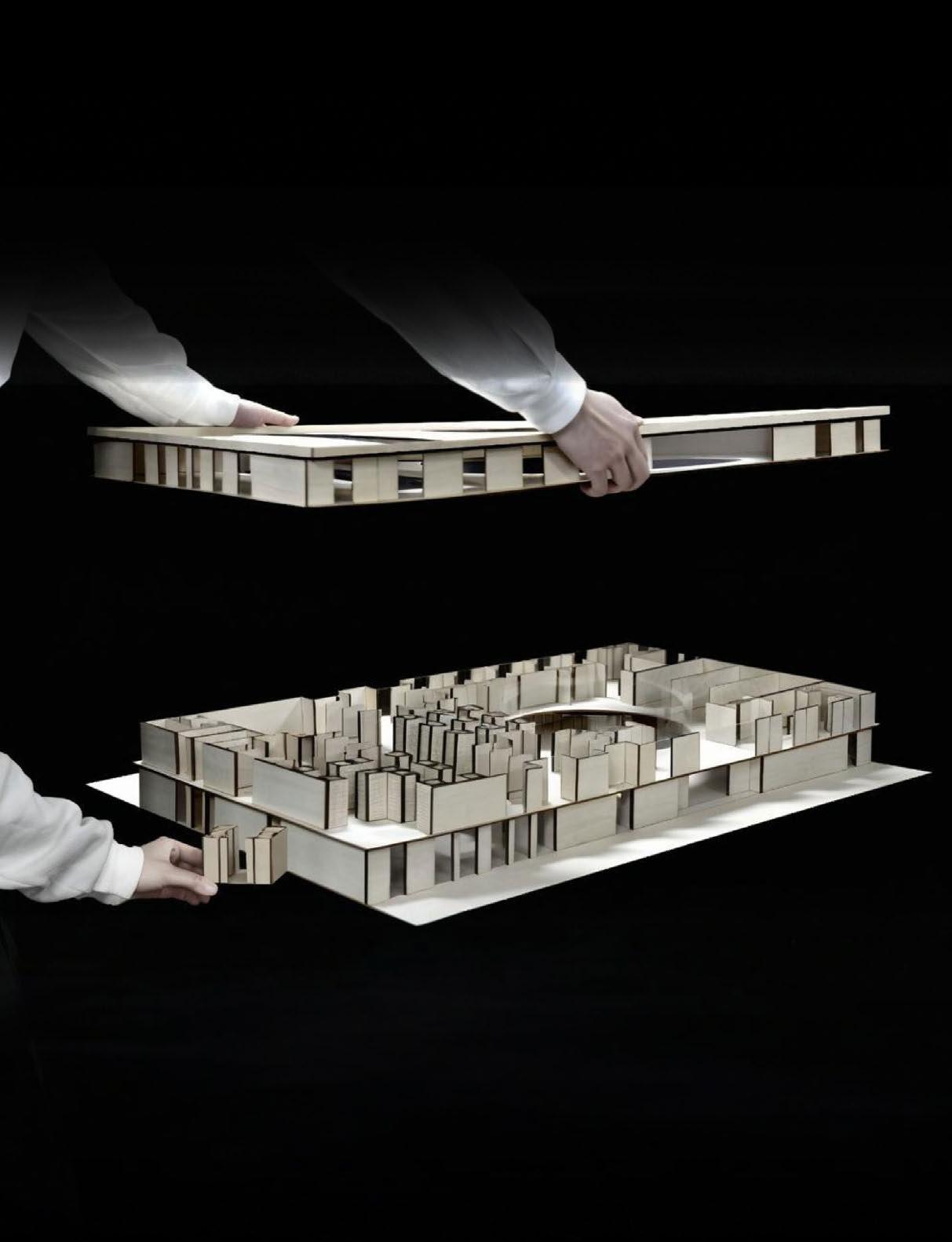 residual or purely recreational, the design positions openness as an active mediator between social support systems and domestic privacy. Shared courtyards and transitional thresholds are carefully calibrated to foster informal interaction while preserving personal autonomy. The massing strategy organizes three linear clusters that extend the surrounding urban fabric, reinforcing neighborhood continuity while maintaining sufficient