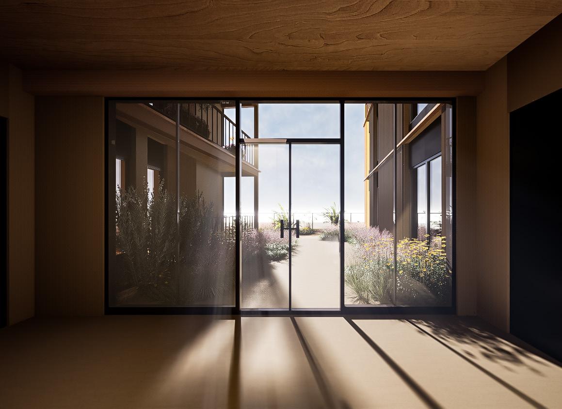 Living spaces surround plantings on the living floor, enabling residents to customize their homes based on individual needs, with shared service spaces like kitchens and bathrooms