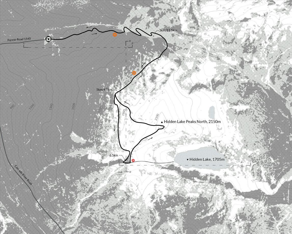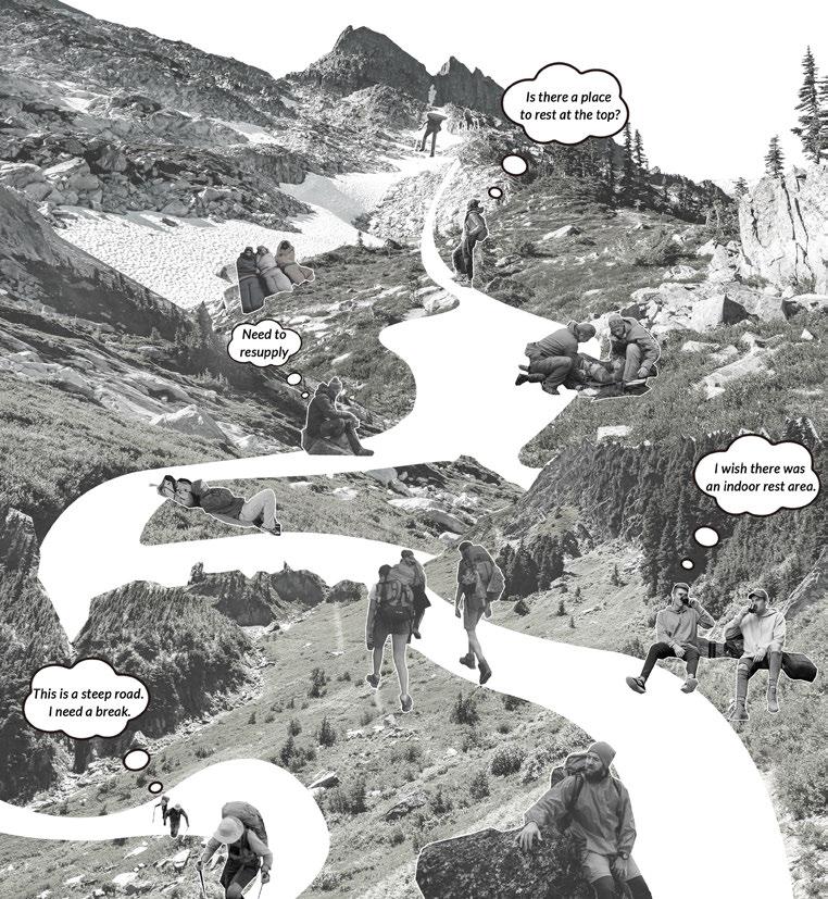 Hidden Lake Lookout is a well trafficked hike in North Cascades National Park, and the nearby Hidden Lake is a popular backcountry camping destination, making this a very busy spot for outdoor recreationalists. To reach the mountaintop and enjoy the beautiful scenery, hikers need to embark on a roughly four-hour trek. Given the significant elevation gain and lack of supply facilities along the way, the journey can be quite challenging. Therefore, this design proposes the establishment of rest stops along the route and at the mountaintop to enhance the hikers' overall travel experience.